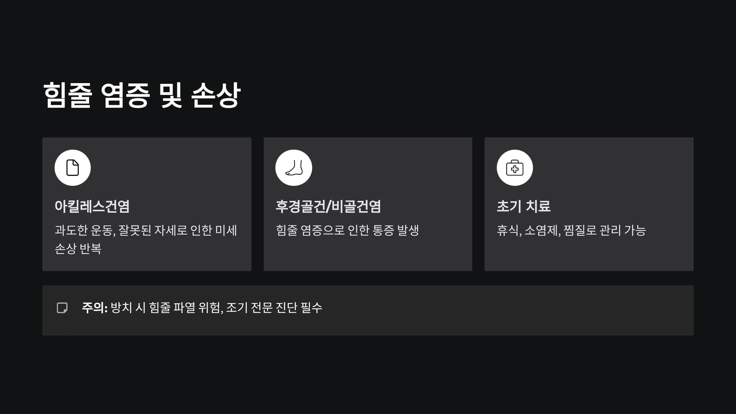 | RICE 원칙 | 염증 및 부종 최소화 | 급성 염좌, 초기 발목 통증 | 냉찜질 필수 |