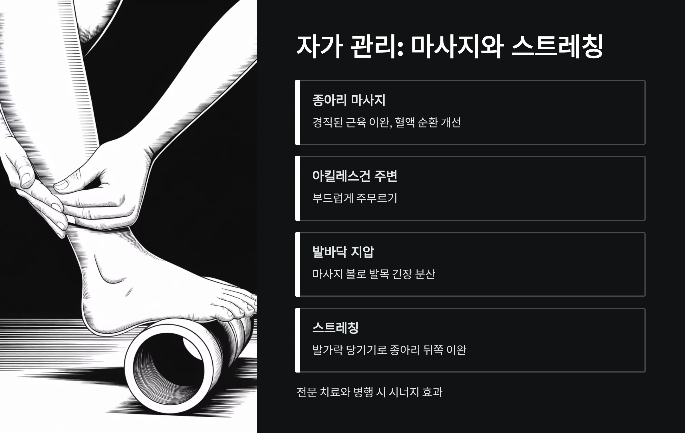 발목 통증 완화를 위한 마사지는 경직된 근육을 이완시키고 혈액 순환을 개선하는 효과적인 자가 관리법입니다. 종아리 근육과 아킬레스건 주변을 부드럽게 주무르고, 마사지 볼로 발바닥을 지압하면 발목 긴장이 분산됩니다.