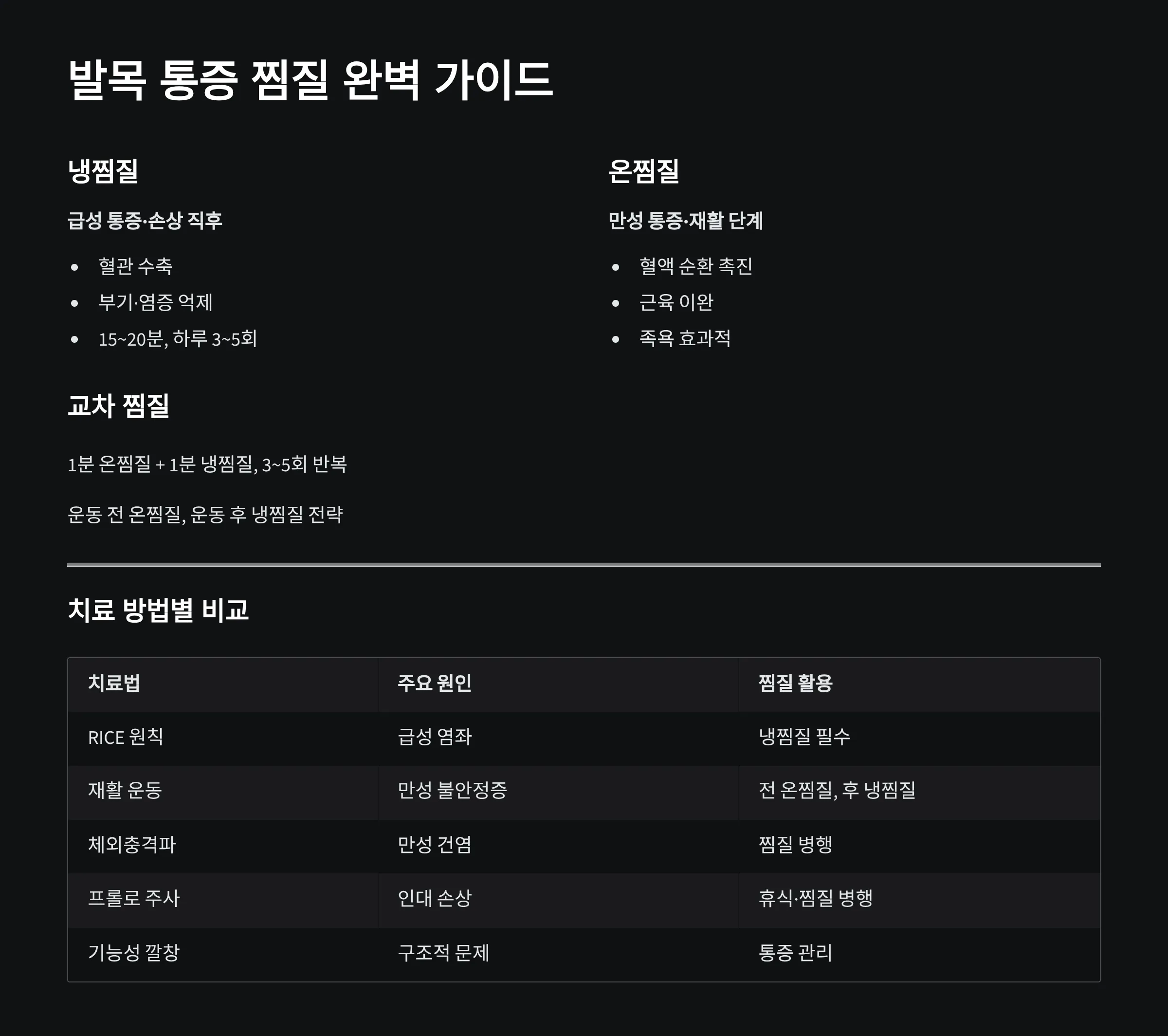 | 치료/관리법 | 주요 작용 원리 | 주요 발목 통증 원인 | 발목 통증 찜질 활용 |