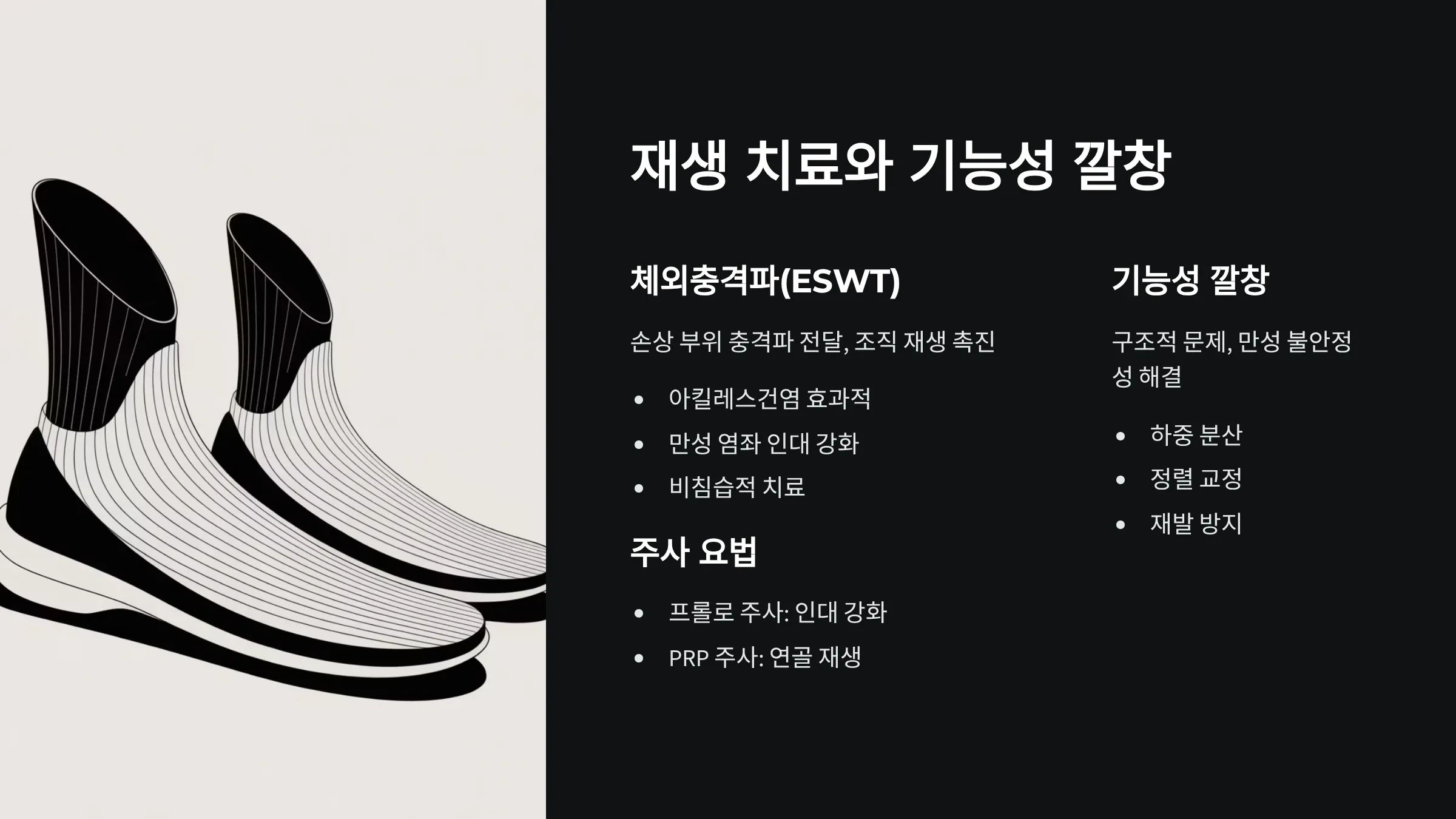 재생 치료 (체외충격파, 주사 요법) 및 기능성 깔창 활용