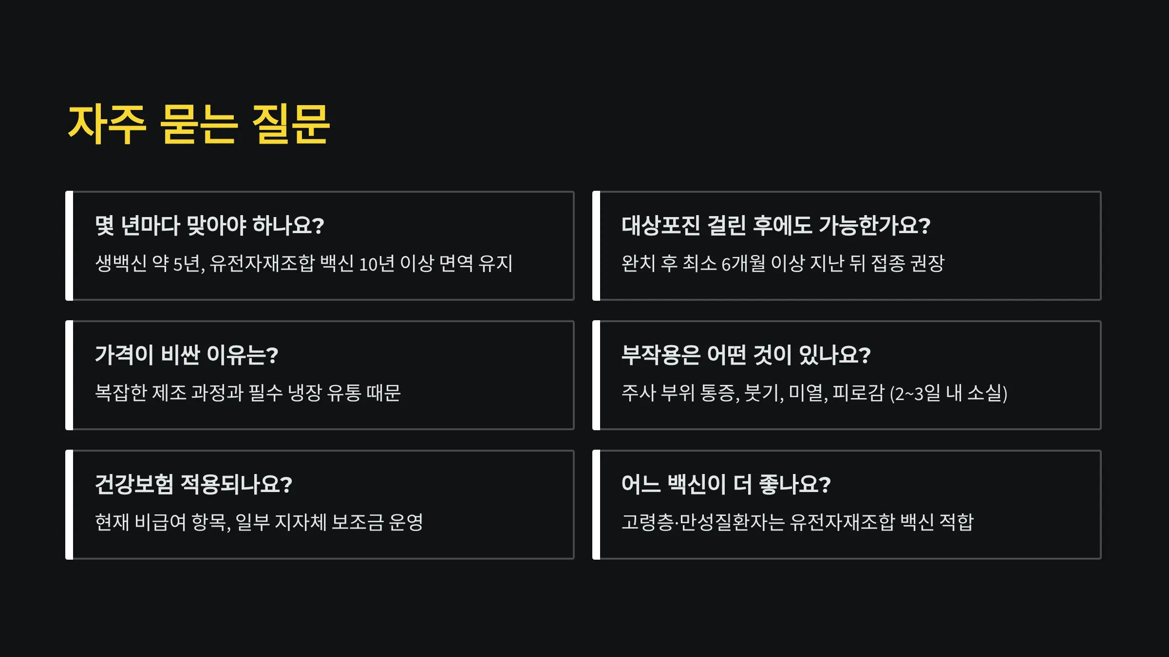 | 싱그릭스 (유전자재조합) | 2회 | 50만~60만 원 | 예방률 높고 장기 지속 효과 우수 |