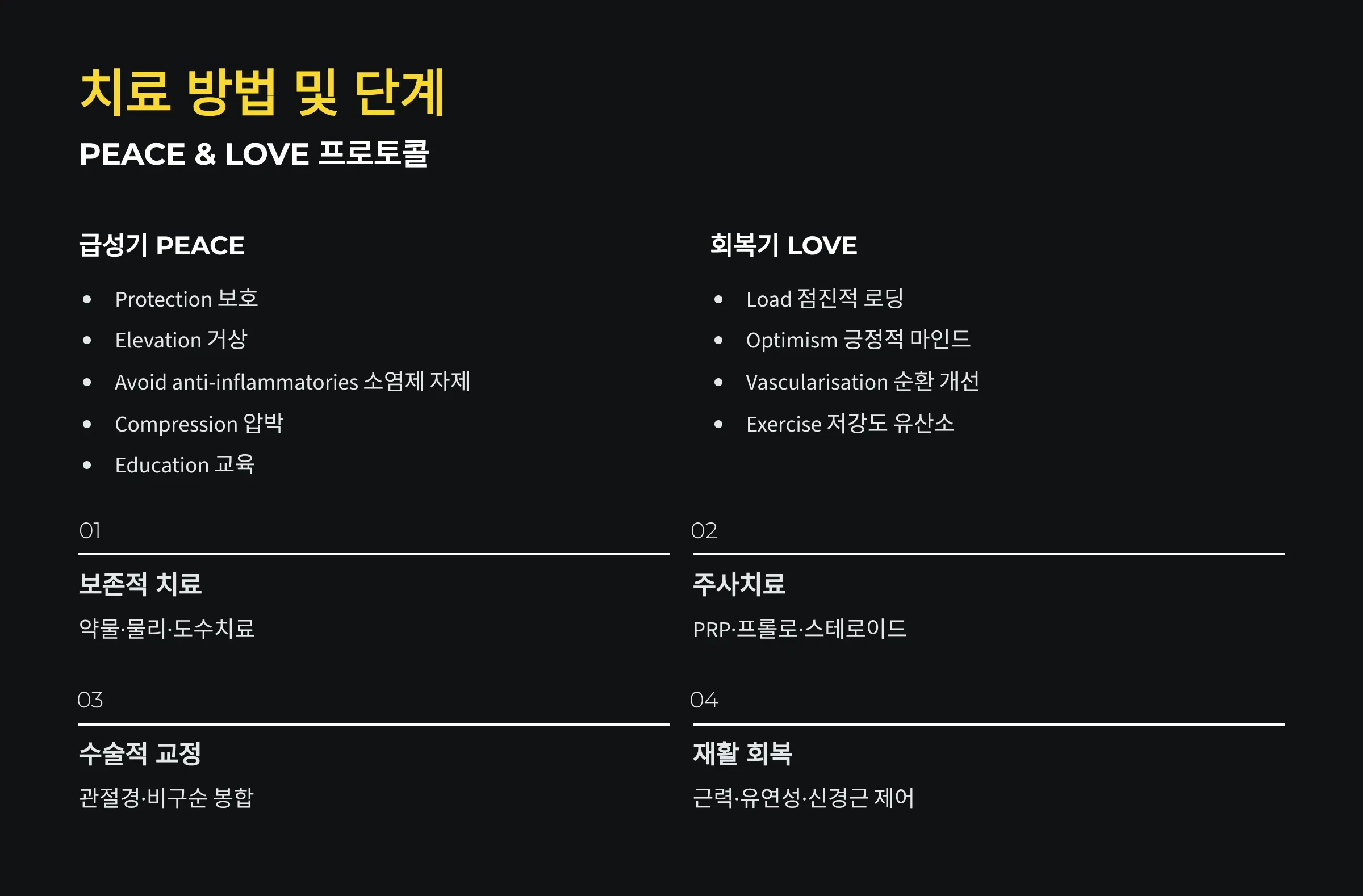 | 관절경·수술 | 구조 문제 교정 | 회복 기간·위험 | 명확한 병변·기능 제한 |
