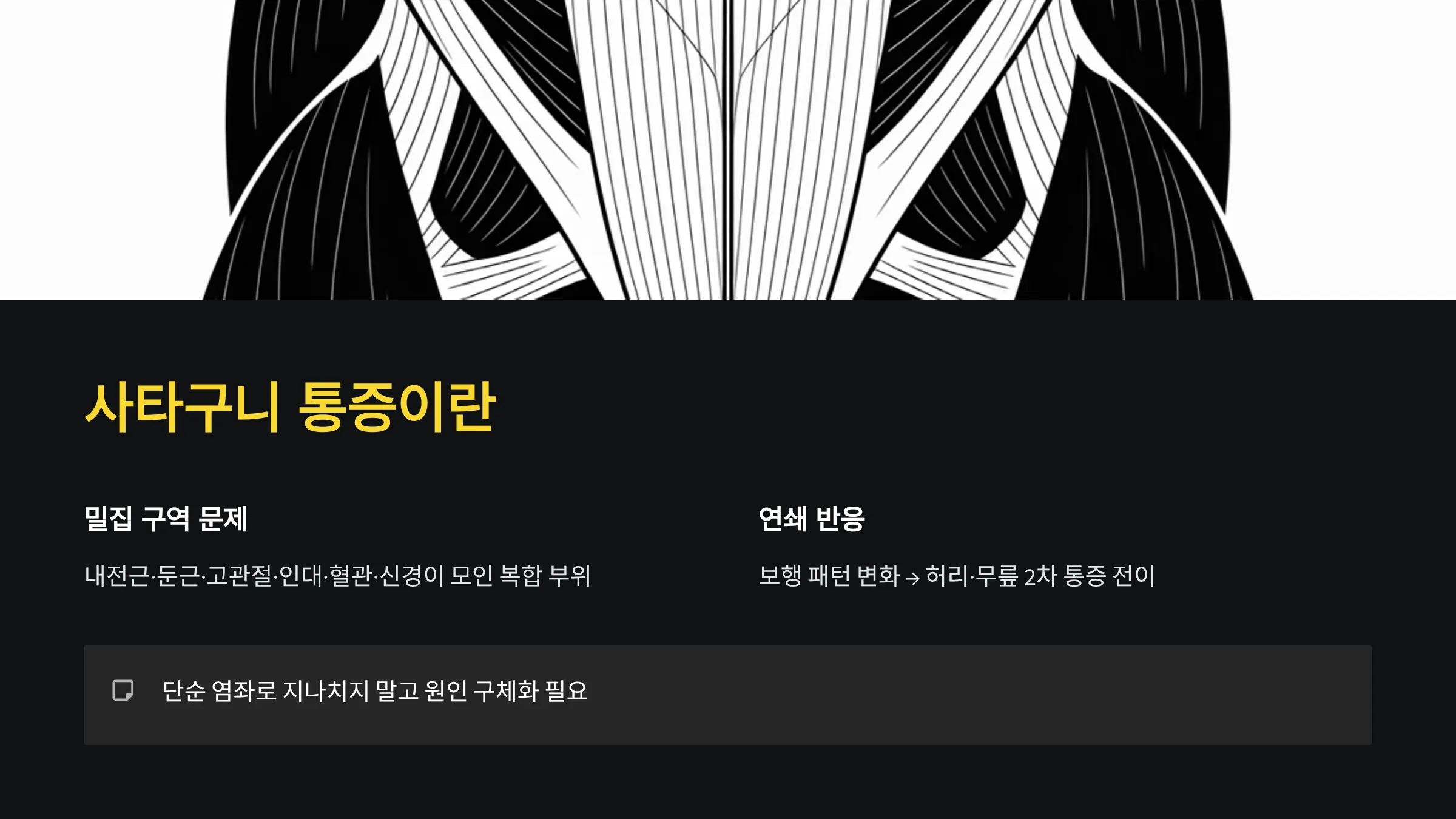 사타구니 통증은 내전근·둔근·고관절·서혜부 인대·혈관·신경이 밀집한 구역에서 발생하는 통증으로, 한 부위 문제만이 아니라 주변 조직의 연쇄적 기능 저하로도 악화됩니다.