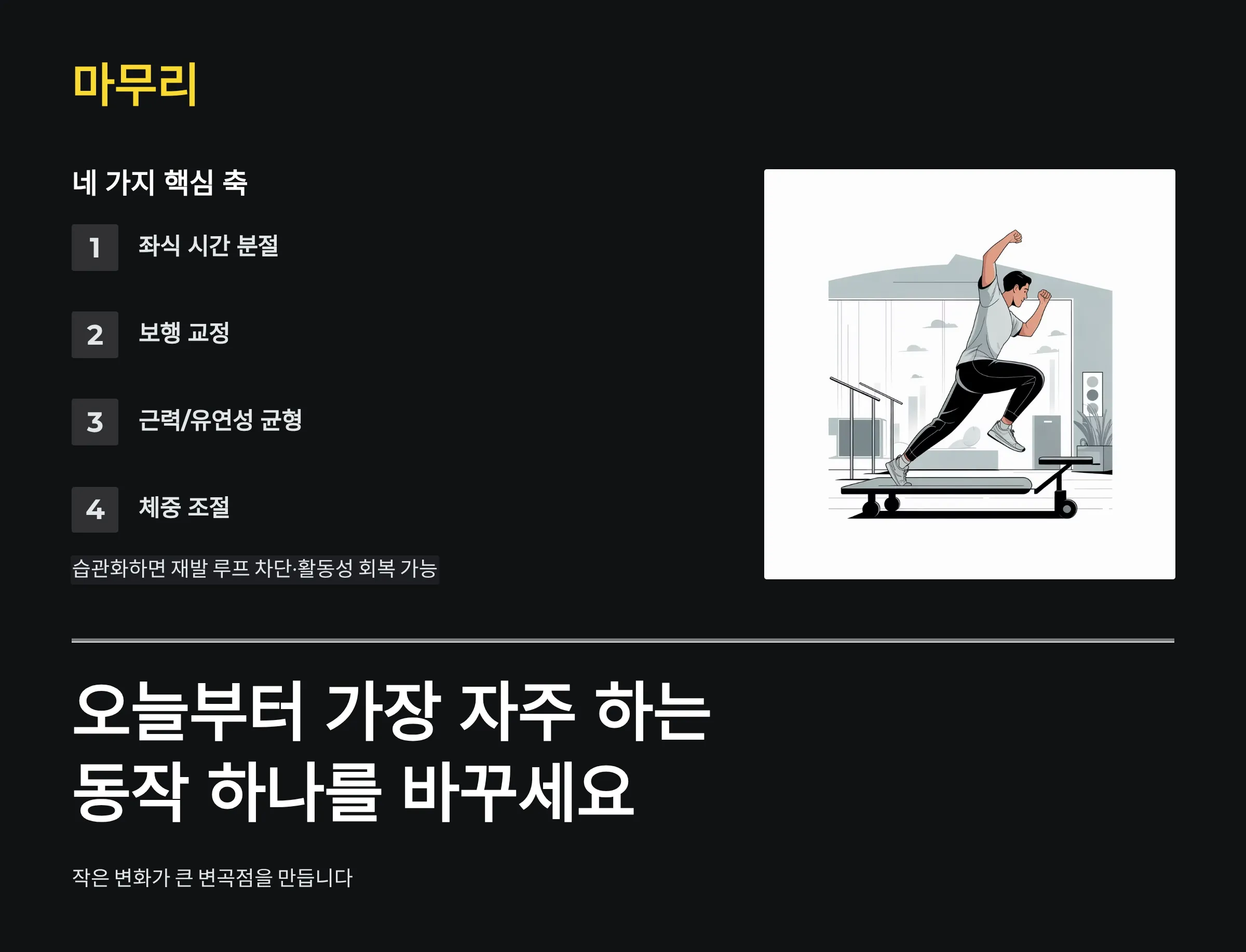 | 재활·운동 | 재발 억제·기능 회복 | 지속성 필요 | 전 단계 병행 |