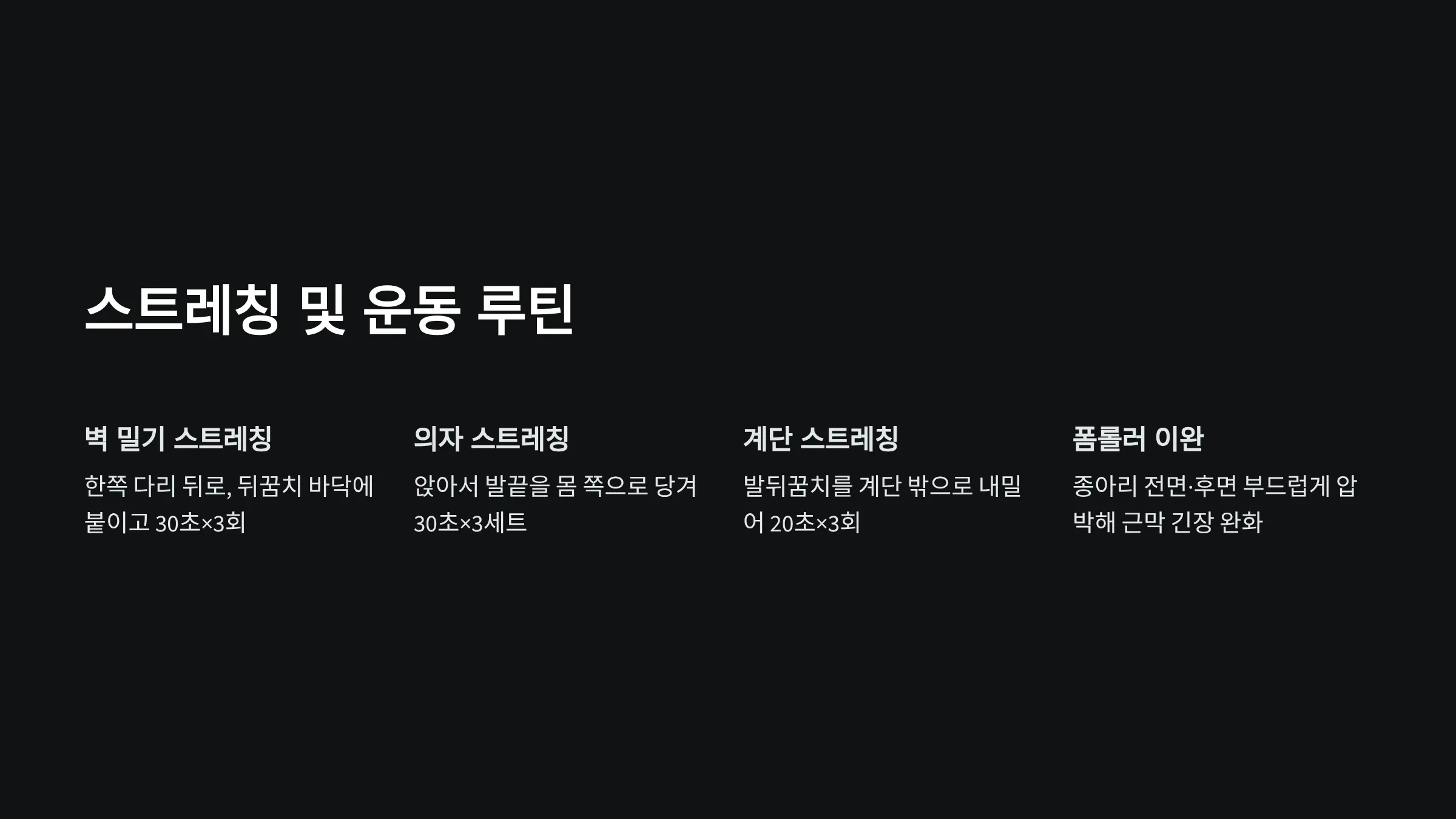 1) 벽 밀기 스트레칭: 한쪽 다리를 뒤로 빼고 뒤꿈치를 바닥에 붙인 채 30초 유지×3회
