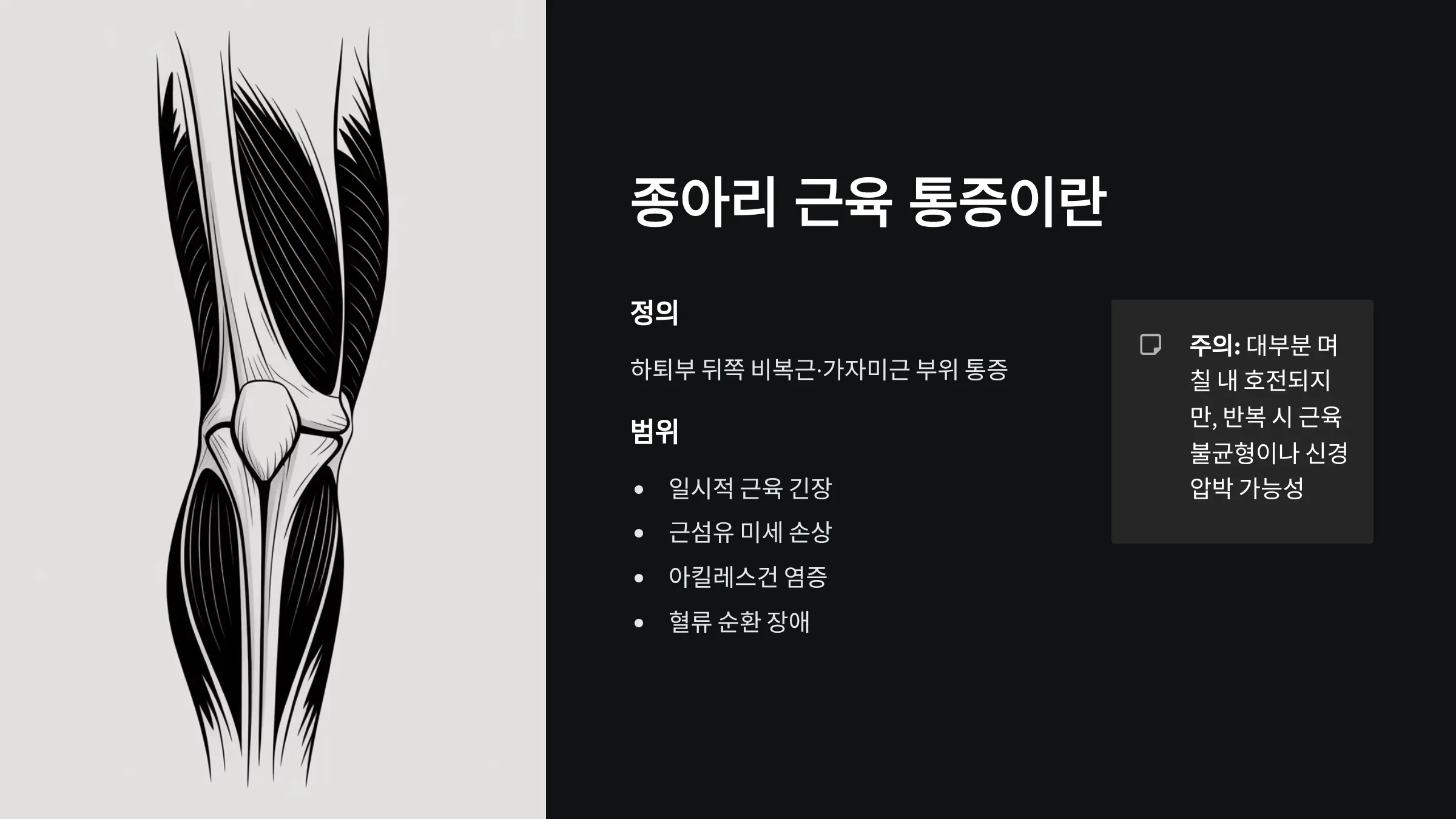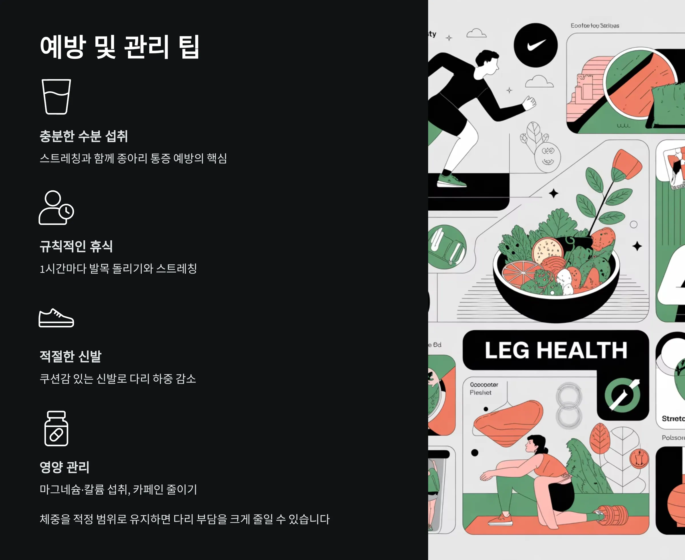 • 충분한 스트레칭과 수분 섭취는 종아리 근육 통증 예방의 핵심입니다.