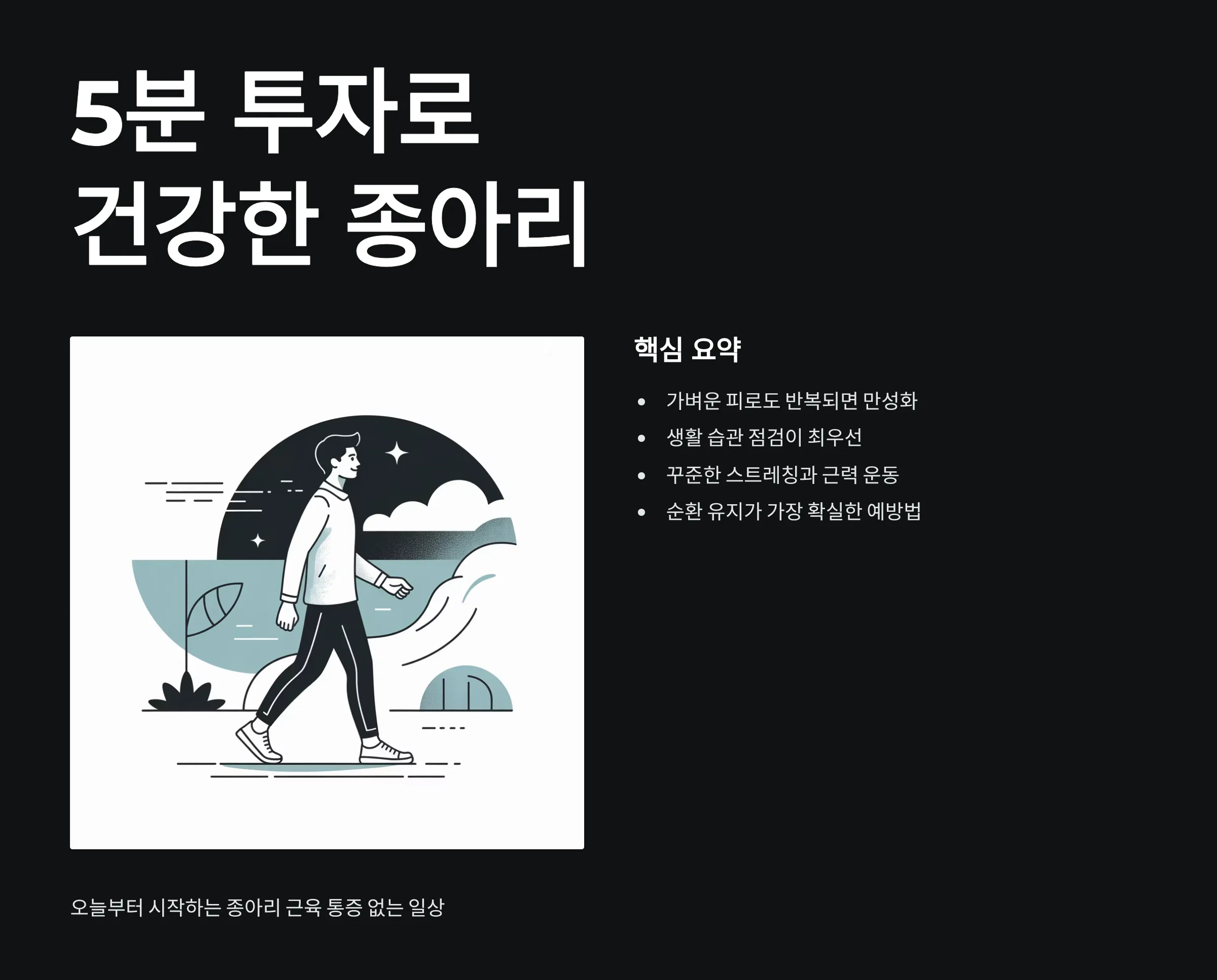 종아리 근육 통증은 가벼운 피로처럼 보여도 반복되면 만성화되기 쉽습니다. 생활 습관을 점검하고, 꾸준한 스트레칭과 하체 근력 운동으로 순환을 유지하는 것이 가장 확실한 예방법입니다. 오늘부터 5분만 투자해도 종아리 근육 통증 없는 일상에 한 걸음 다가설 수 있습니다.