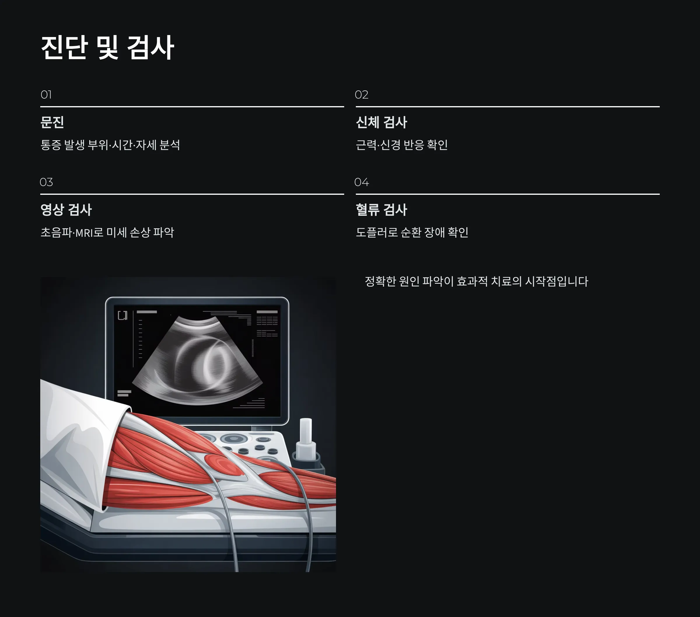 진단은 통증 발생 부위·시간·자세를 분석하는 문진부터 시작합니다. 이후 근력·신경 반응 검사를 통해 통증의 원인이 근육, 건, 혈관, 신경 중 어디에 있는지를 확인합니다.