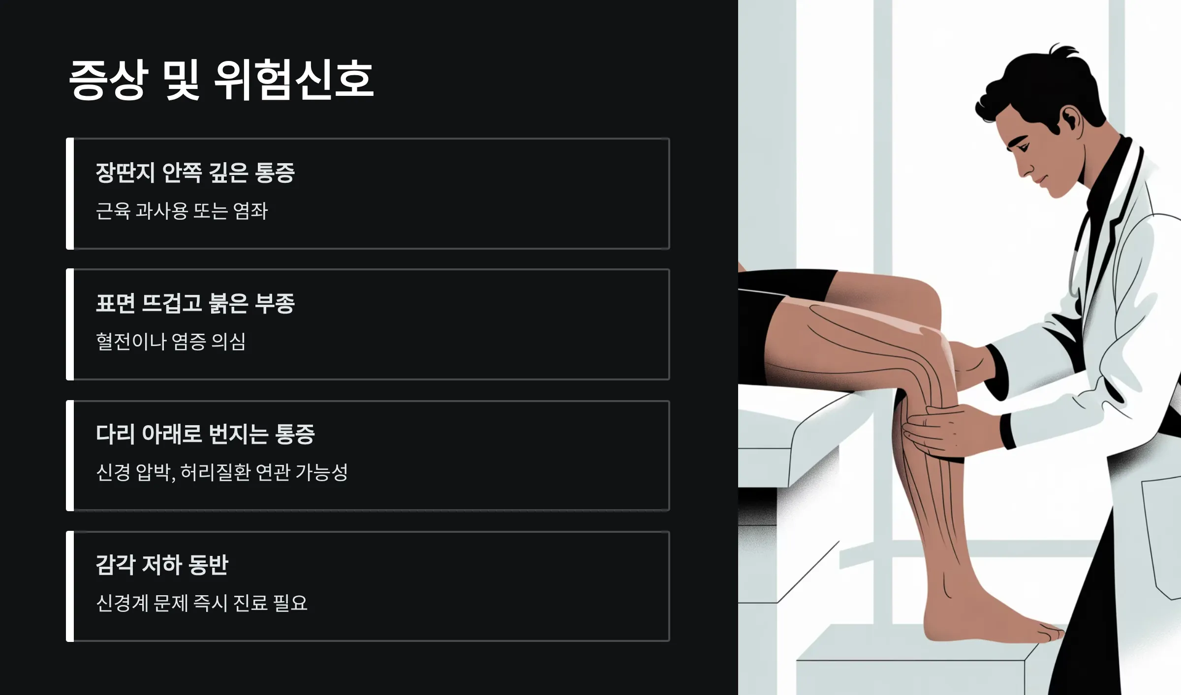 통증이 한 달 이상 지속되거나 다리 붓기, 색 변화가 동반될 경우 혈관·신경계 이상일 가능성이 있으므로 전문 진료가 필요합니다. 또한, 재발을 막기 위해서는 생활습관과 자세 교정이 반드시 병행되어야 합니다.