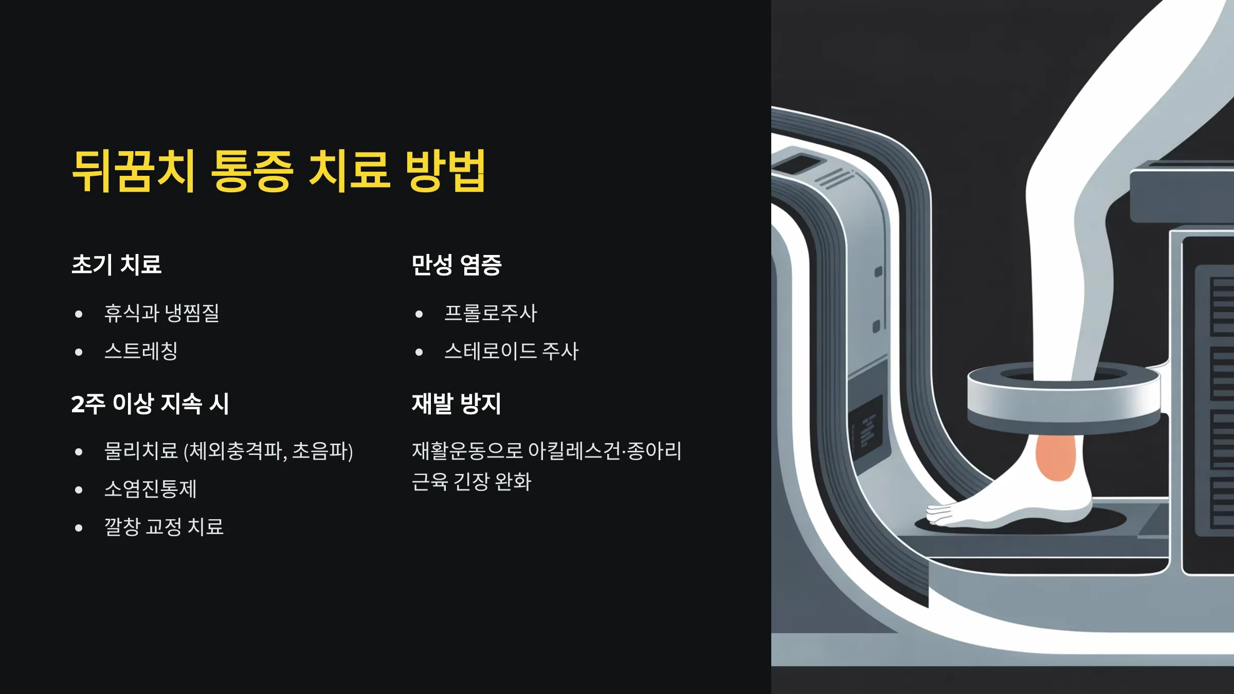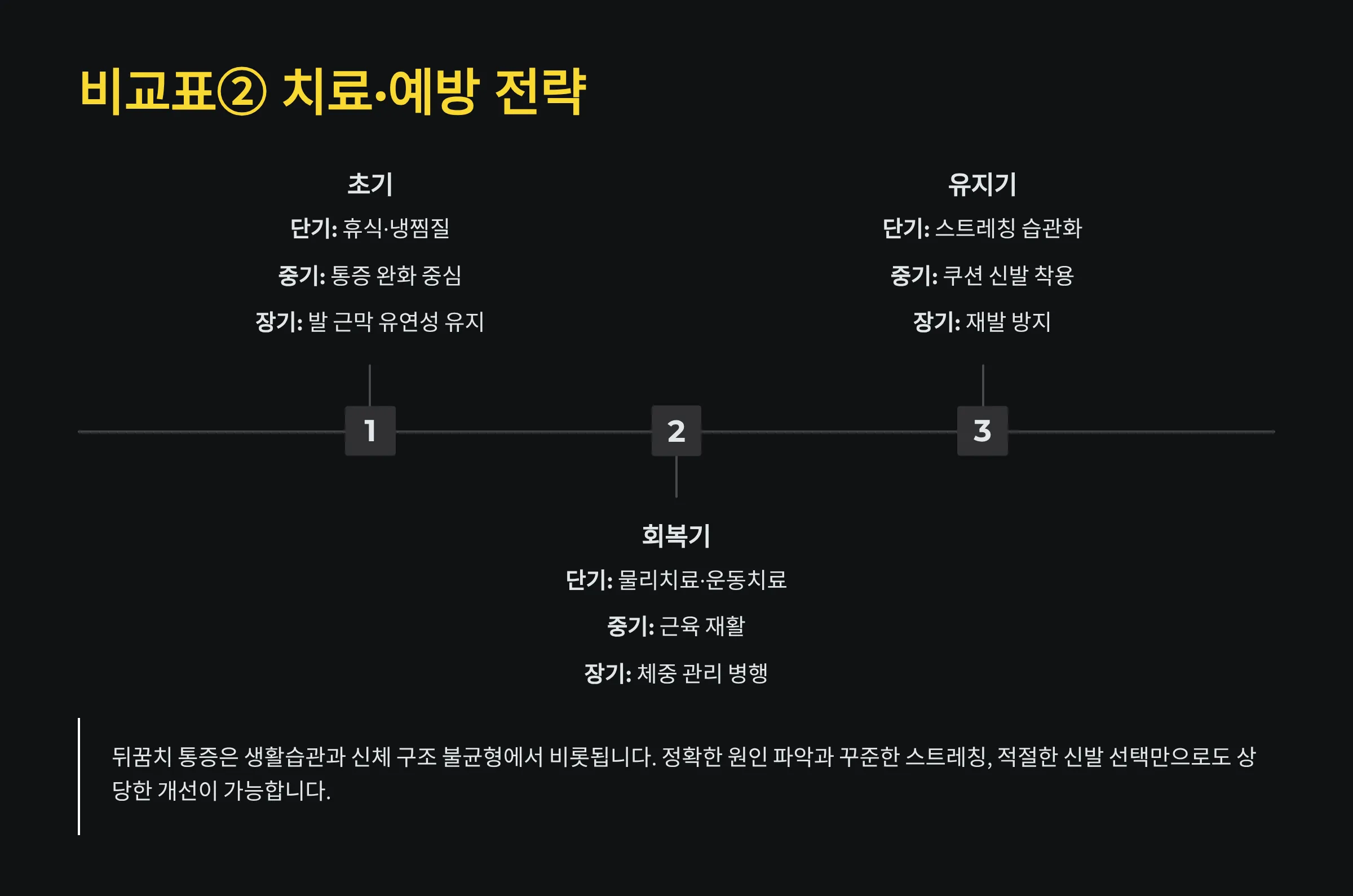 | 초기 | 휴식·냉찜질 | 통증 완화 중심 | 근막 유연성 확보 |