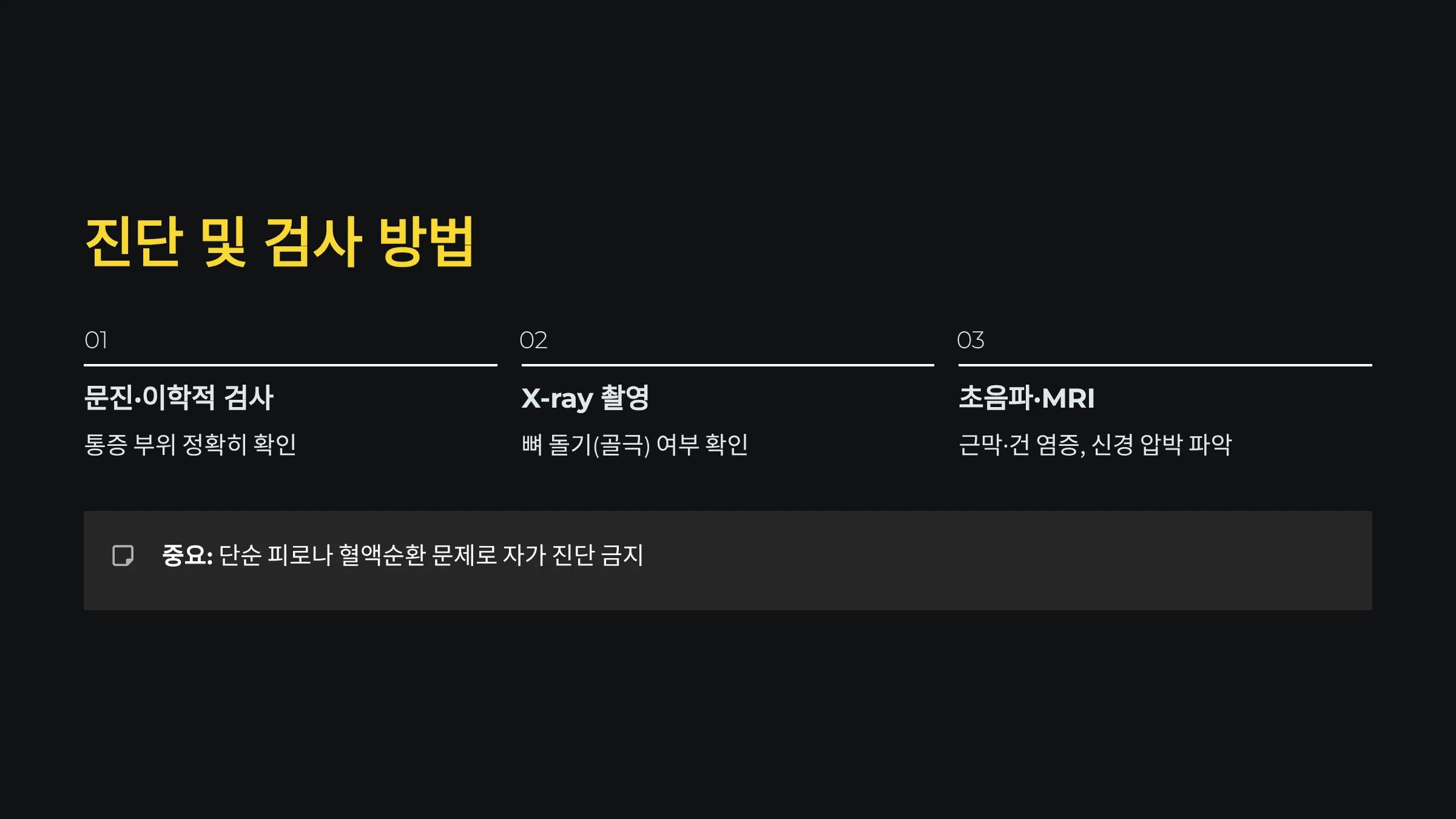 병원에서는 문진과 촉진을 통해 통증 부위를 확인하고, 필요 시 X-ray로 뼈 돌기(골극) 여부를 검사합니다.