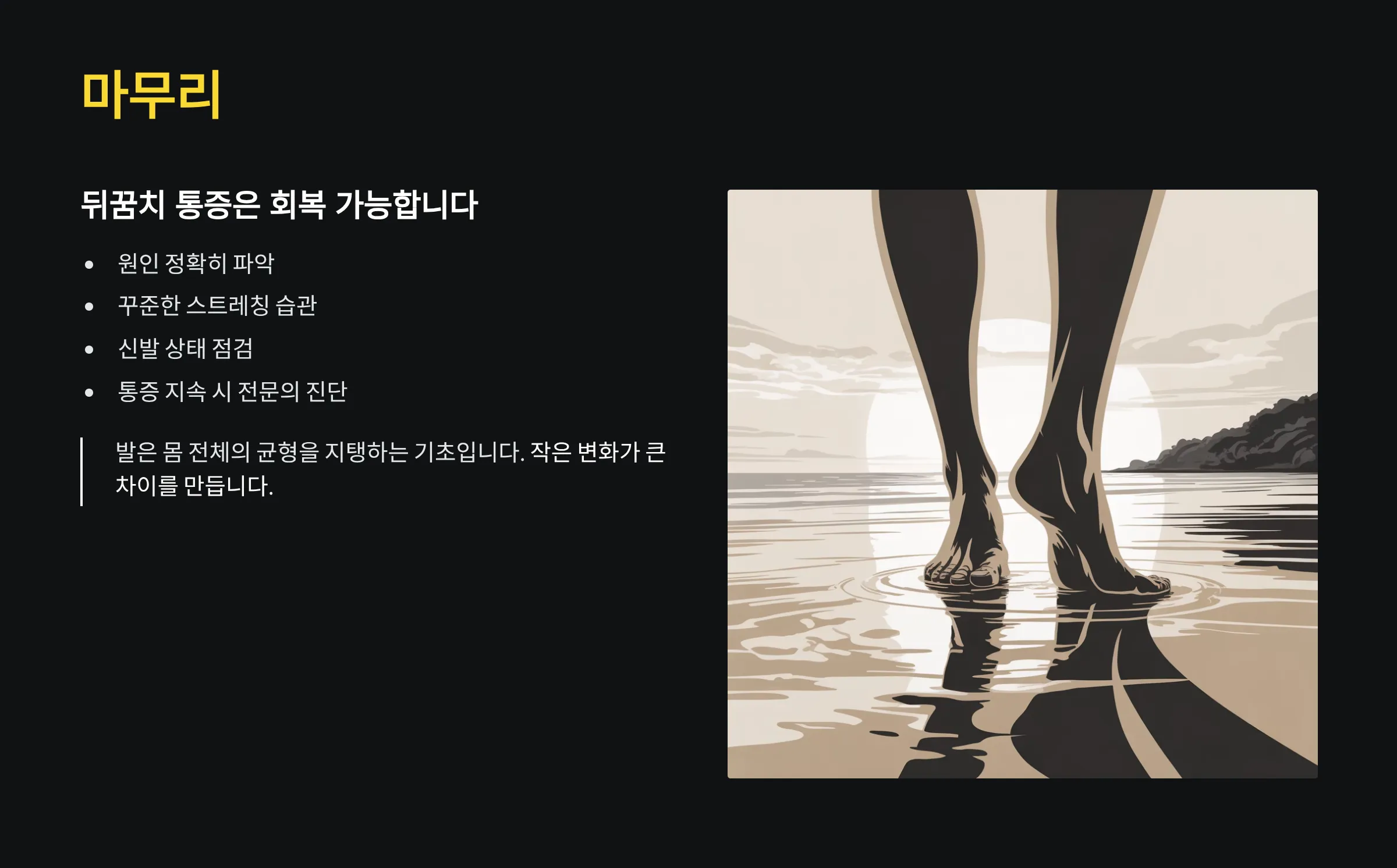 뒤꿈치 통증은 단순한 피로가 아닌 발 건강의 경고 신호입니다. 조기에 적절한 치료와 스트레칭을 병행하면 대부분 호전됩니다. 통증이 지속된다면 전문의 진단을 받아 정확한 원인을 파악하고 꾸준히 관리하세요.