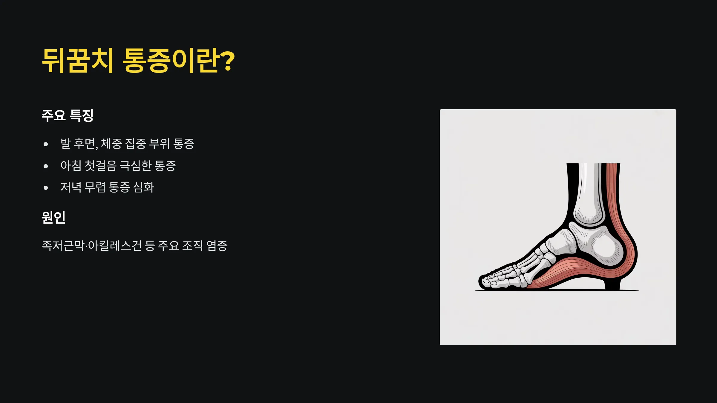가장 흔한 원인은 족저근막염입니다. 발바닥 근막이 과도하게 당겨져 염증이 생기면 뒤꿈치 통증이 나타나며, 주로 오래 서 있거나 운동량이 많은 사람에게 발생합니다.