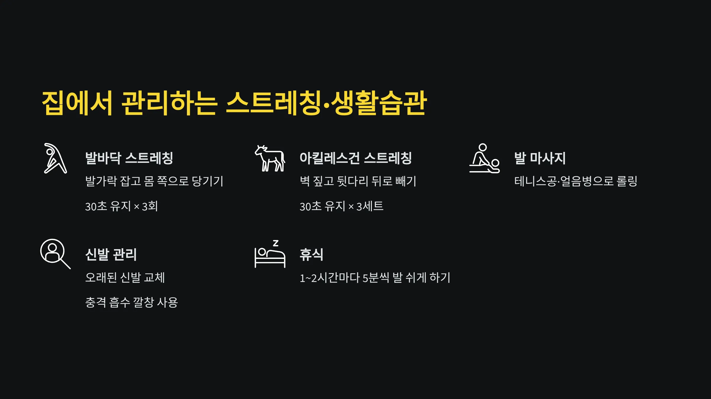 | 유지기 | 스트레칭 습관화 | 쿠션 신발 착용 | 재발 방지 |