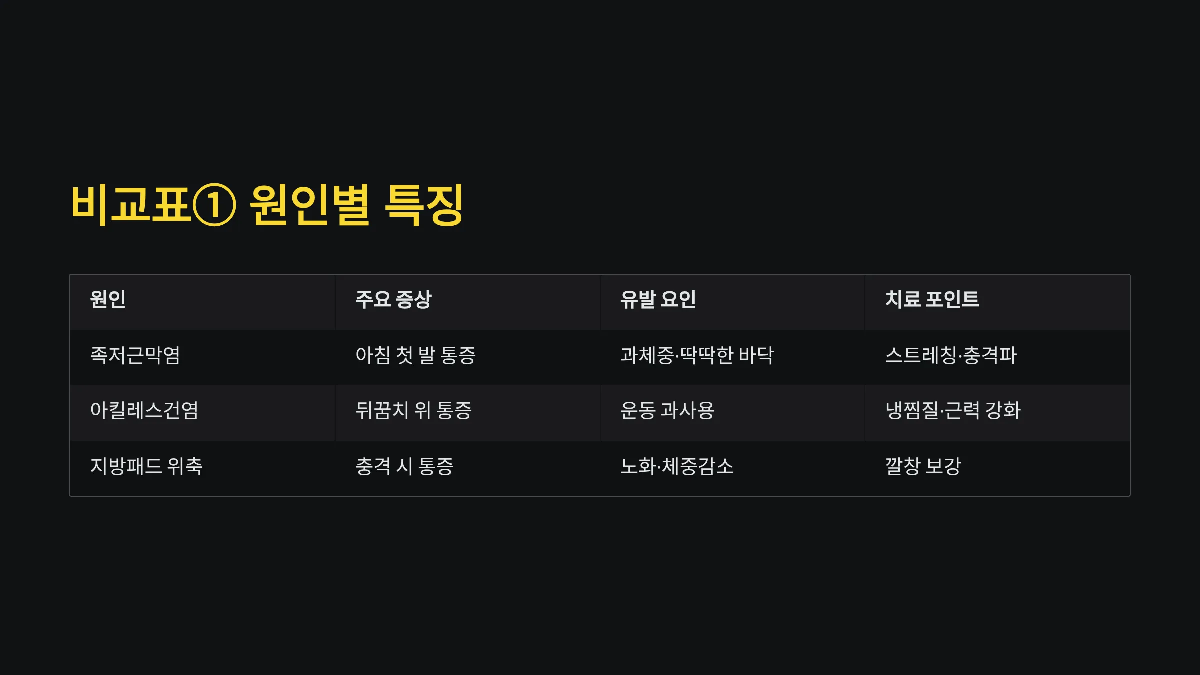| 족저근막염 | 아침 첫 발 통증 | 과체중, 딱딱한 바닥 | 스트레칭, 충격파 |