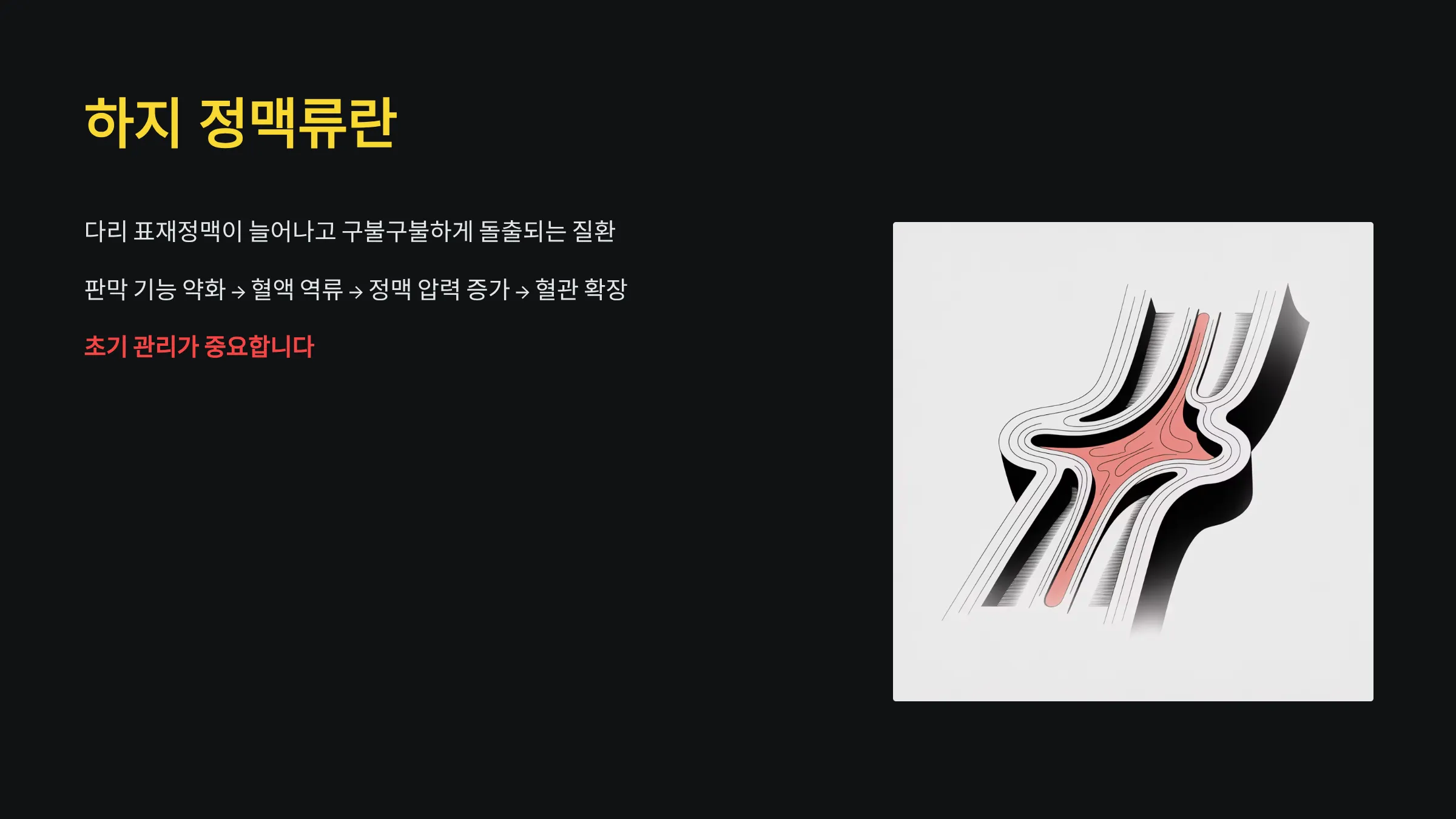 하지 정맥류는 미용적인 문제로 시작하지만, 점차 다리의 피로감·부종·통증 등 기능적 불편으로 발전할 수 있어 방치하면 안 됩니다. 초기에는 피로감만 느껴도, 진행되면 걷거나 서 있는 것조차 힘들어지기 때문에 조기 관리가 중요합니다.