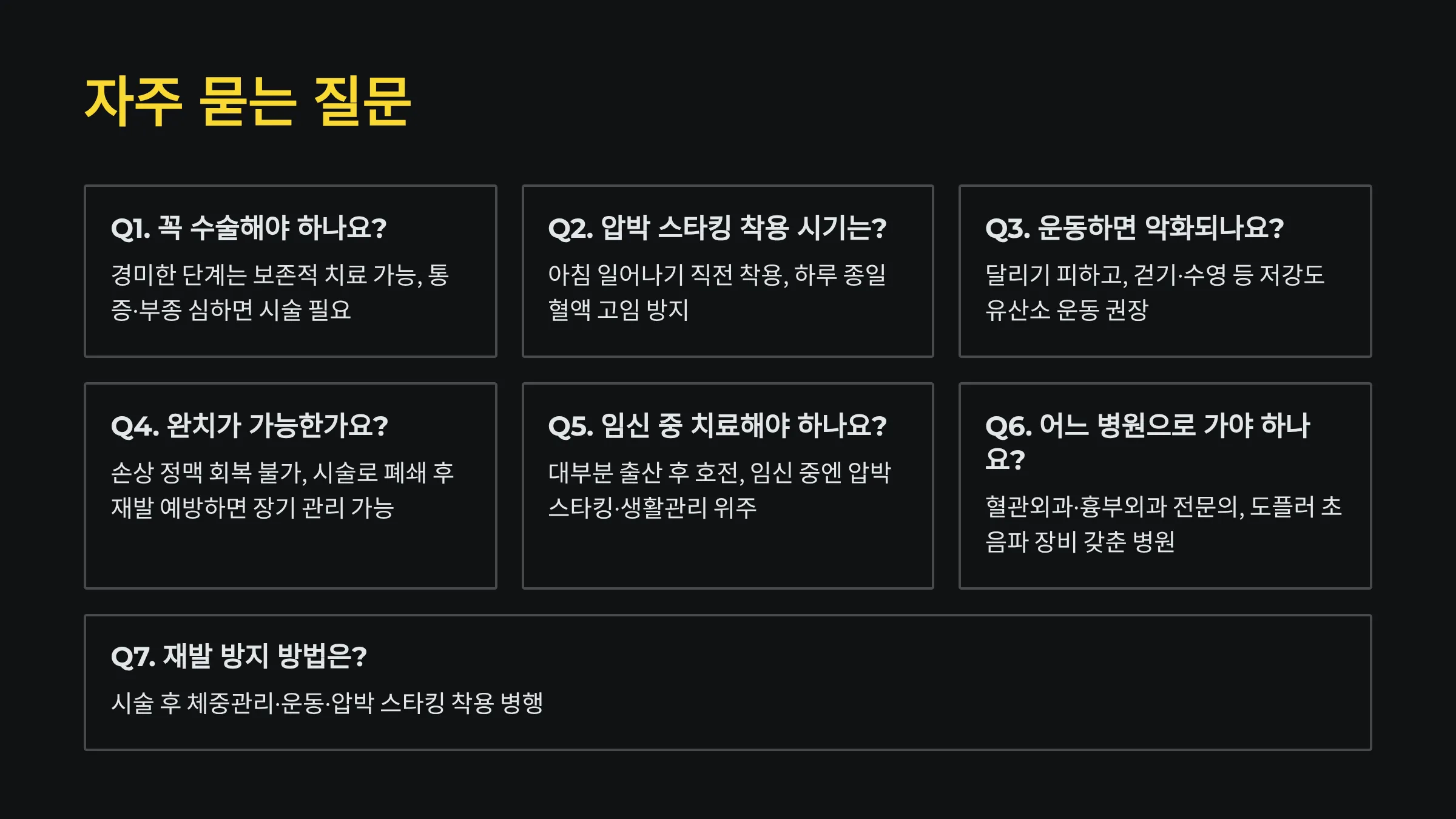 A. 시술 후에도 체중관리·운동·압박 스타킹 착용을 병행해야 재발률을 낮출 수 있습니다.