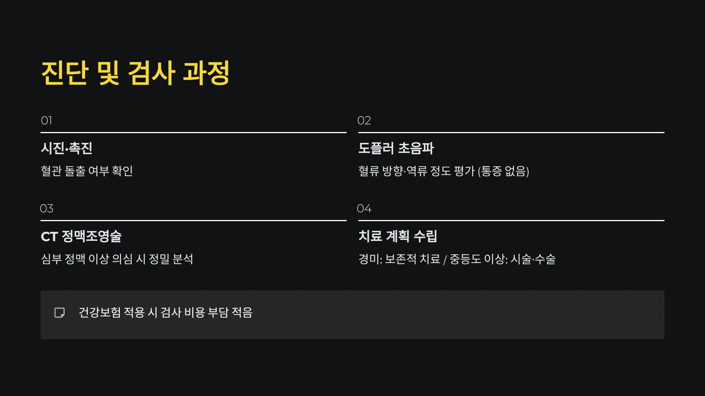 하지 정맥류 병원에서는 시진과 촉진으로 혈관 돌출 여부를 확인한 뒤, 도플러 초음파를 통해 혈류 방향과 역류 정도를 평가합니다. 이 검사는 통증이 없고 빠르게 진행되어, 치료 계획을 세우는 데 필수적입니다. 심부 정맥 이상이 의심될 경우, CT 정맥조영술을 통해 내부 정맥까지 정밀 분석합니다. 검사 결과에 따라 경미한 정맥류는 보존적 치료, 중등도 이상은 시술 또는 수술 치료로 나뉘게 됩니다. 검사 비용은 병원마다 다르지만 건강보험 적용 시 부담이 크지 않으며, 대형 병원과 하지 정맥류 전문클리닉 모두 시행이 가능합니다.