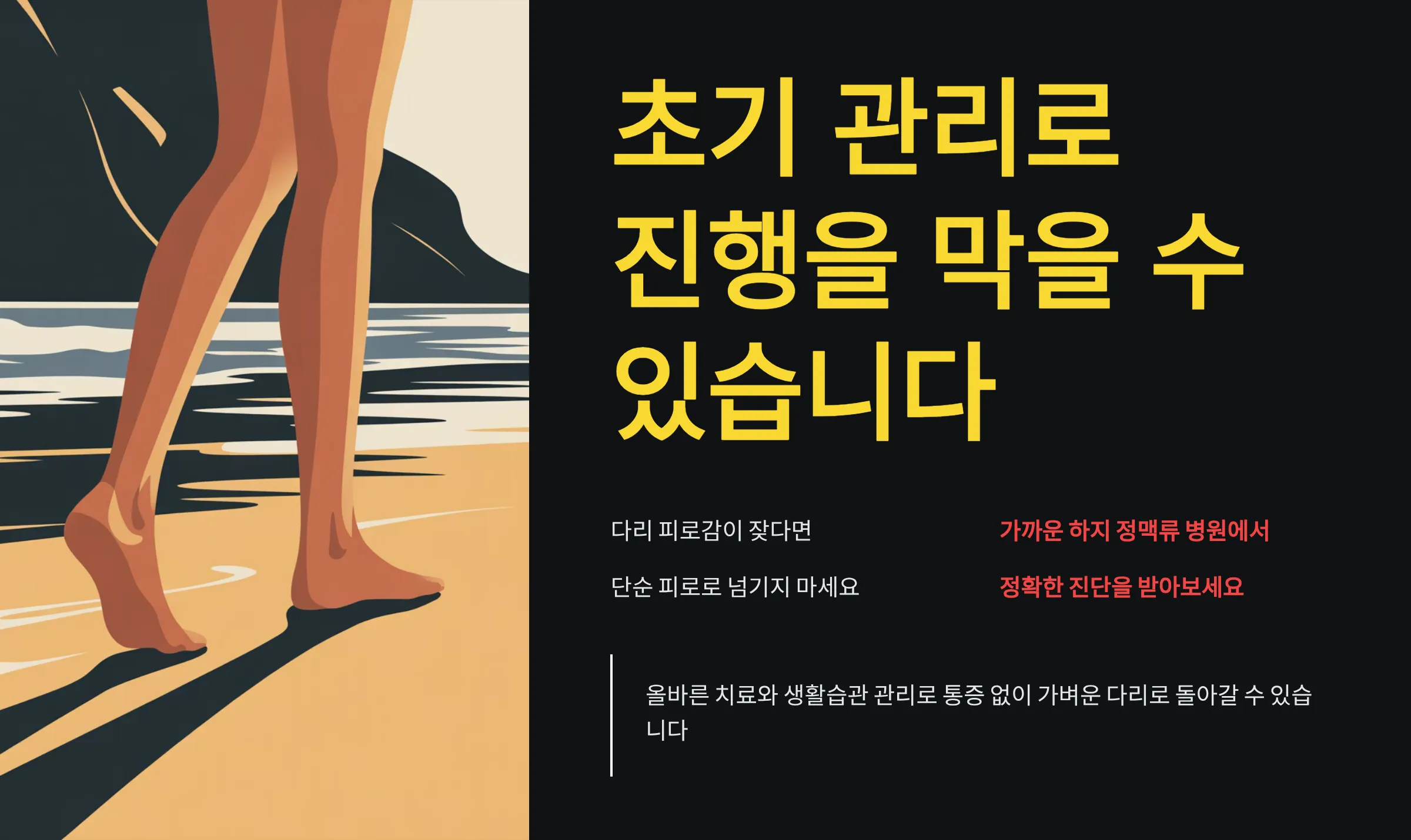하지 정맥류는 초기에 관리하면 진행을 막을 수 있지만, 방치하면 통증과 합병증으로 이어질 수 있습니다. 다리의 피로감이 잦다면, 단순 피로로 넘기지 말고 가까운 하지 정맥류 병원에서 정확한 진단을 받아보세요. 올바른 치료와 생활습관 관리만으로도 통증 없이 가벼운 다리로 돌아갈 수 있습니다.