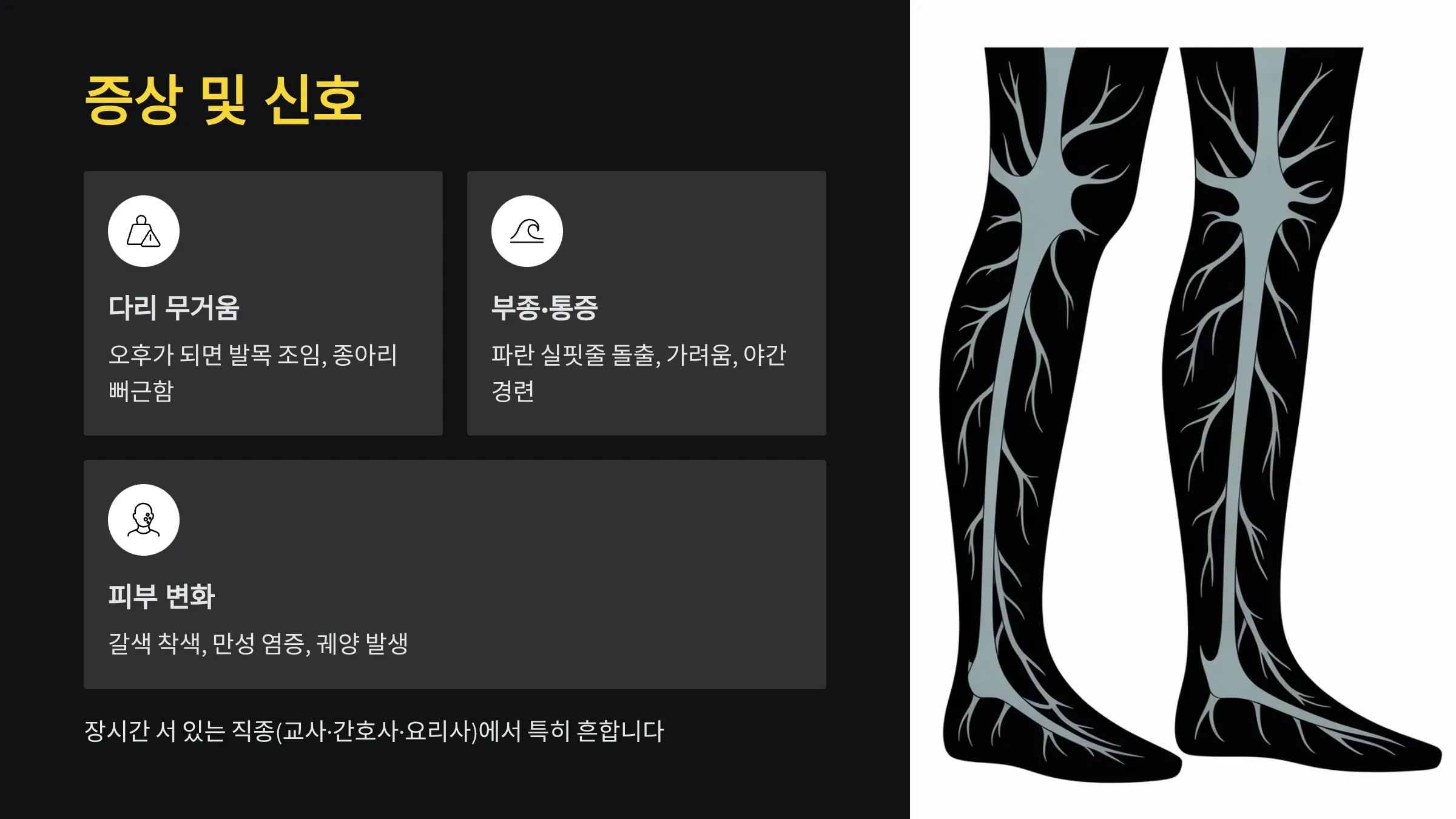 심한 경우, 혈류 정체로 인해 피부 색이 갈색으로 변하거나, 만성 염증·궤양이 발생하기도 합니다. 이런 증상은 장시간 서 있는 직종(교사·간호사·요리사 등)에서 특히 흔하게 보고됩니다.