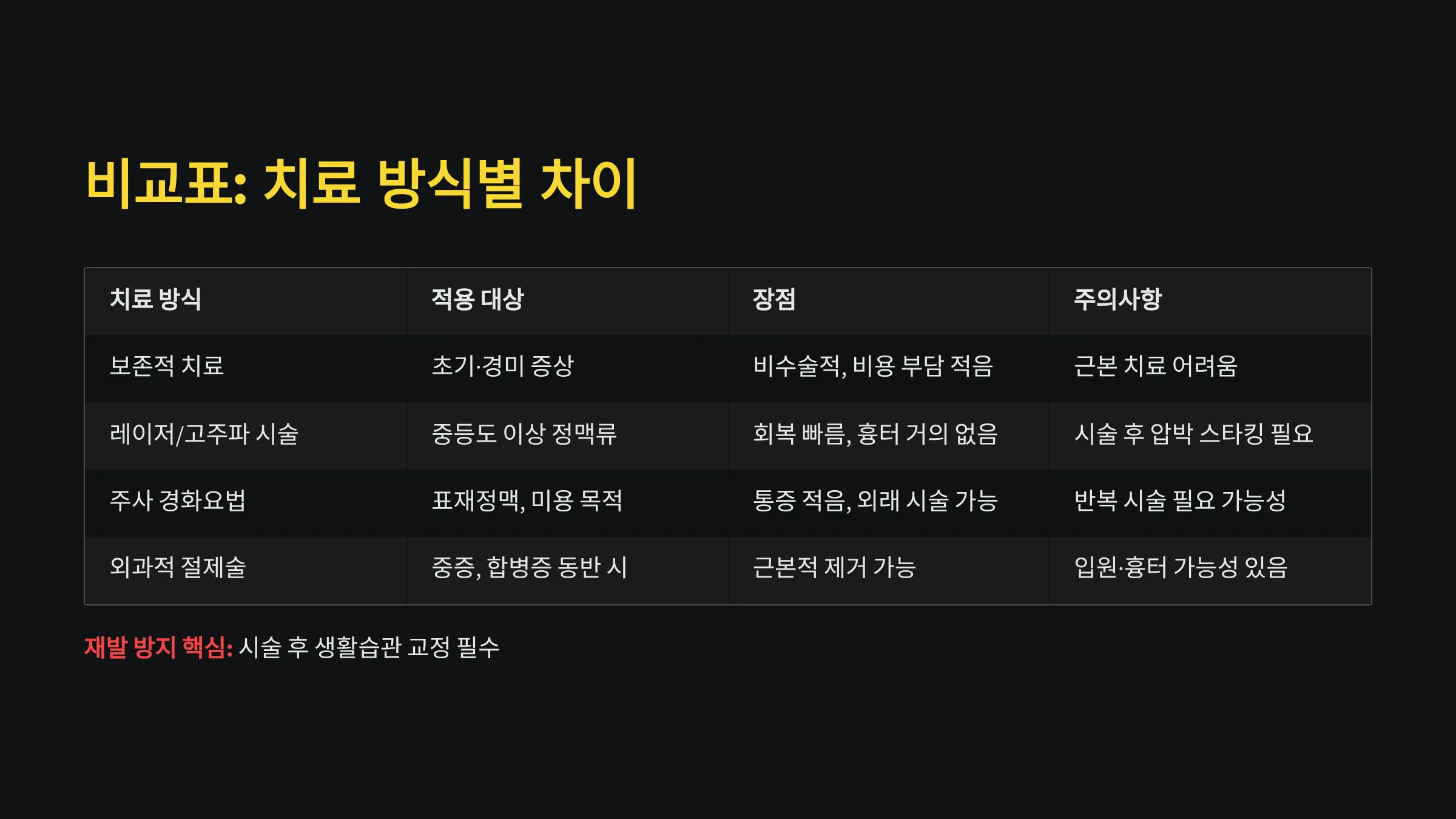 | 주사 경화요법 | 표재정맥, 미용 목적 | 통증 적음, 외래 시술 가능 | 반복 시술 필요 가능성 |