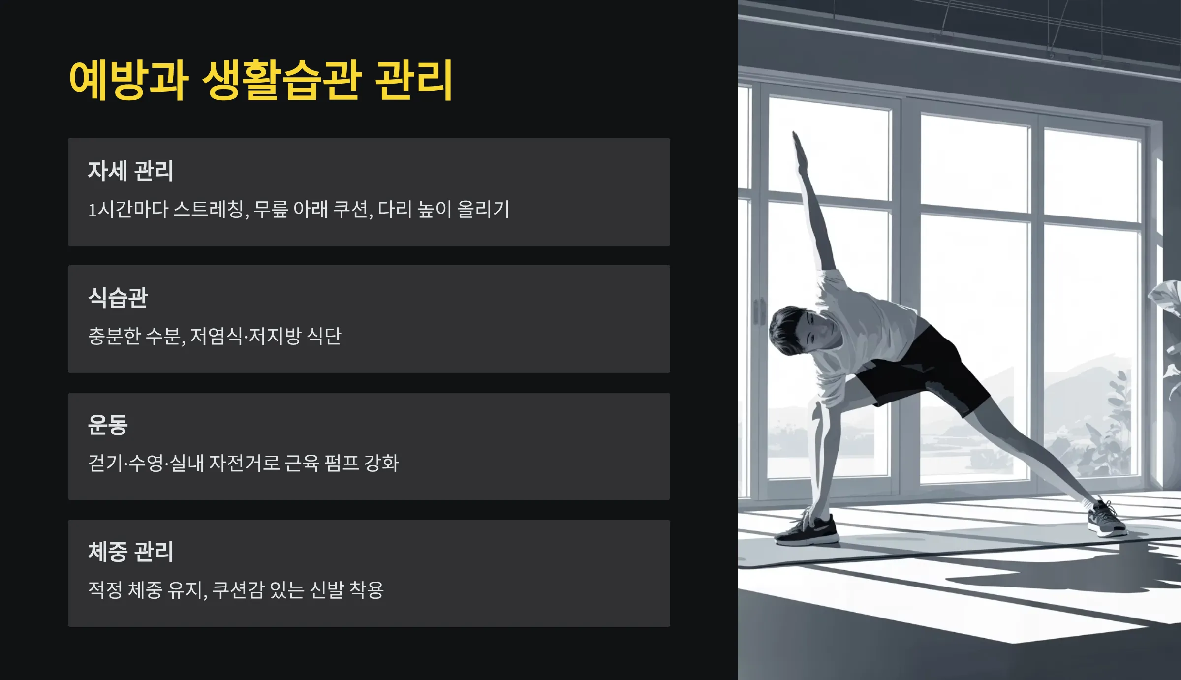 표를 보면 하지 정맥류 치료는 증상 정도에 따라 선택의 폭이 넓습니다. 단기적 완화를 넘어서 재발을 막기 위해서는 시술 후 생활습관 교정이 필수적입니다.