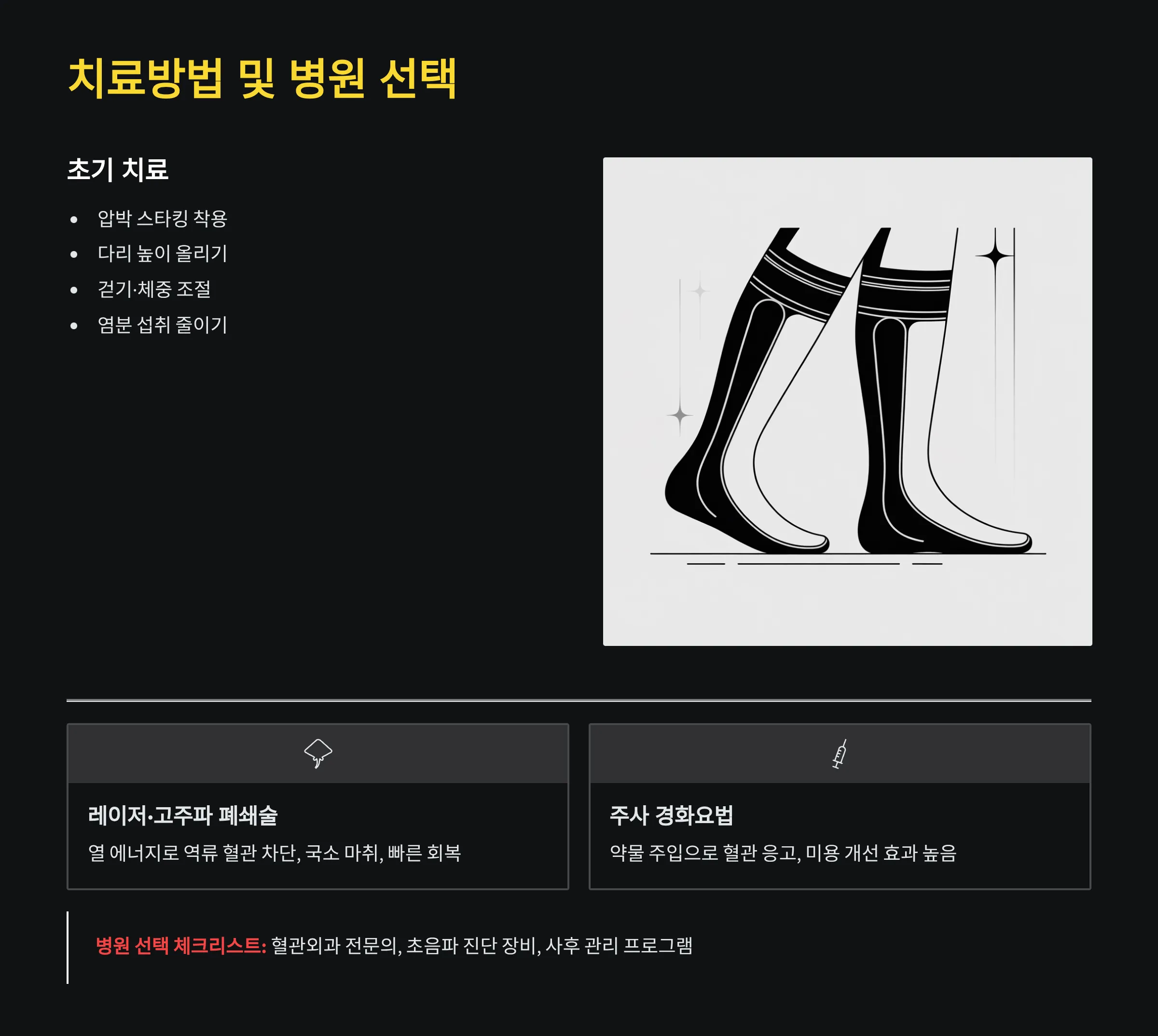 | 레이저/고주파 시술 | 중등도 이상 정맥류 | 회복 빠름, 흉터 거의 없음 | 시술 후 압박 스타킹 필요 |