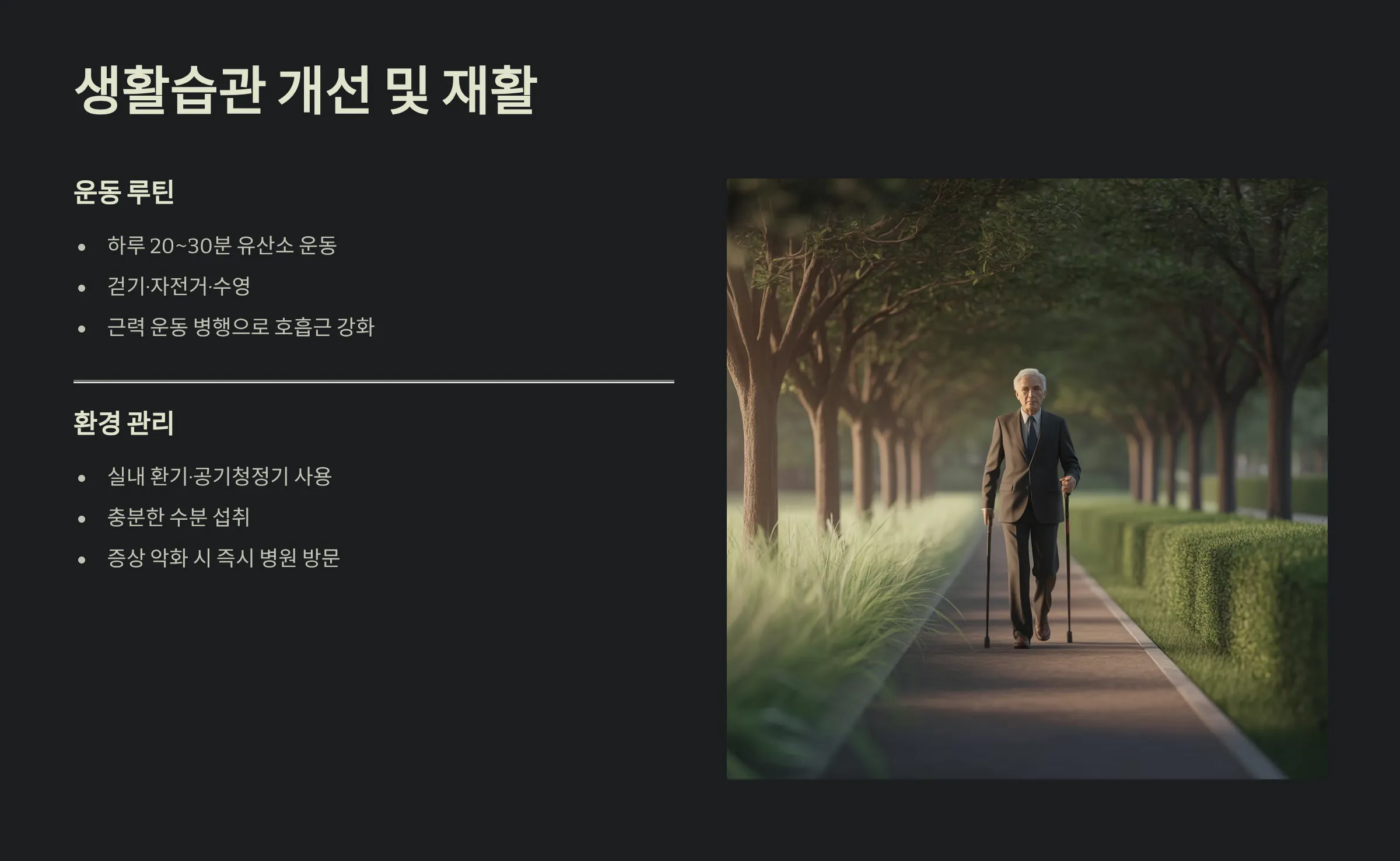 만성 폐쇄성 폐 질환은 조기 진단과 꾸준한 관리로 충분히 안정적인 삶을 유지할 수 있습니다. 금연과 운동, 정기 검진은 치료의 세 축이며, 작은 습관 변화가 호흡의 질을 바꿉니다.
