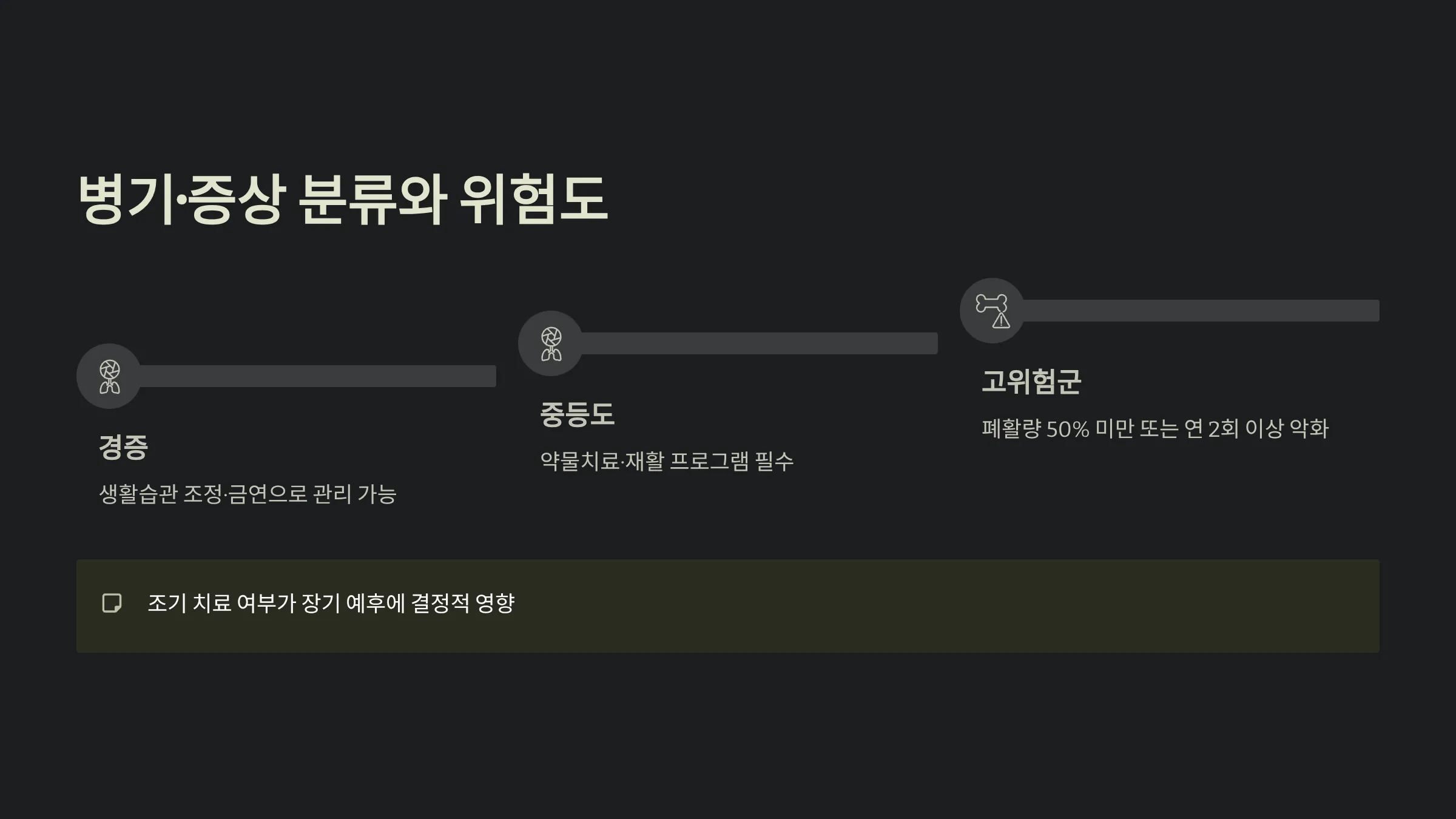 경증 단계에서는 생활습관 조정과 금연만으로도 충분히 관리 가능하지만, 중등도 이상이 되면 약물치료와 재활 프로그램이 필수적입니다. 조기 치료 여부가 장기 예후에 큰 영향을 미칩니다.