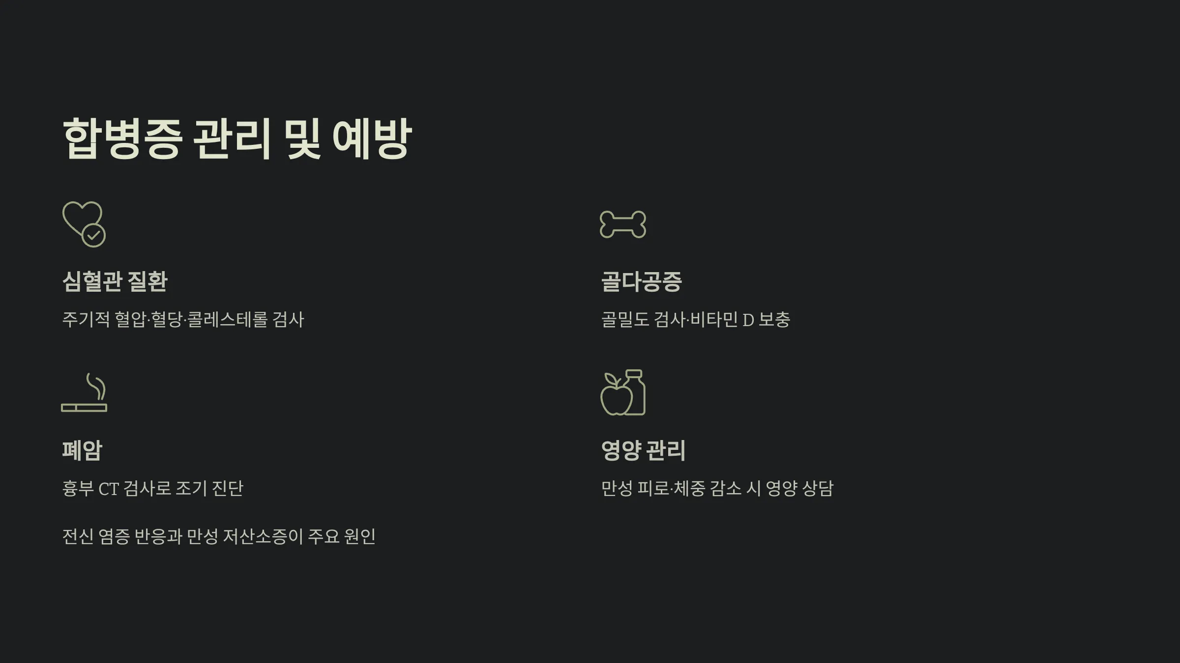 또한 골밀도 검사와 비타민 D 보충은 골절 위험을 낮추는 데 도움이 되며, 만성 피로와 체중 감소가 지속될 경우 영양 상담을 병행하는 것이 좋습니다.