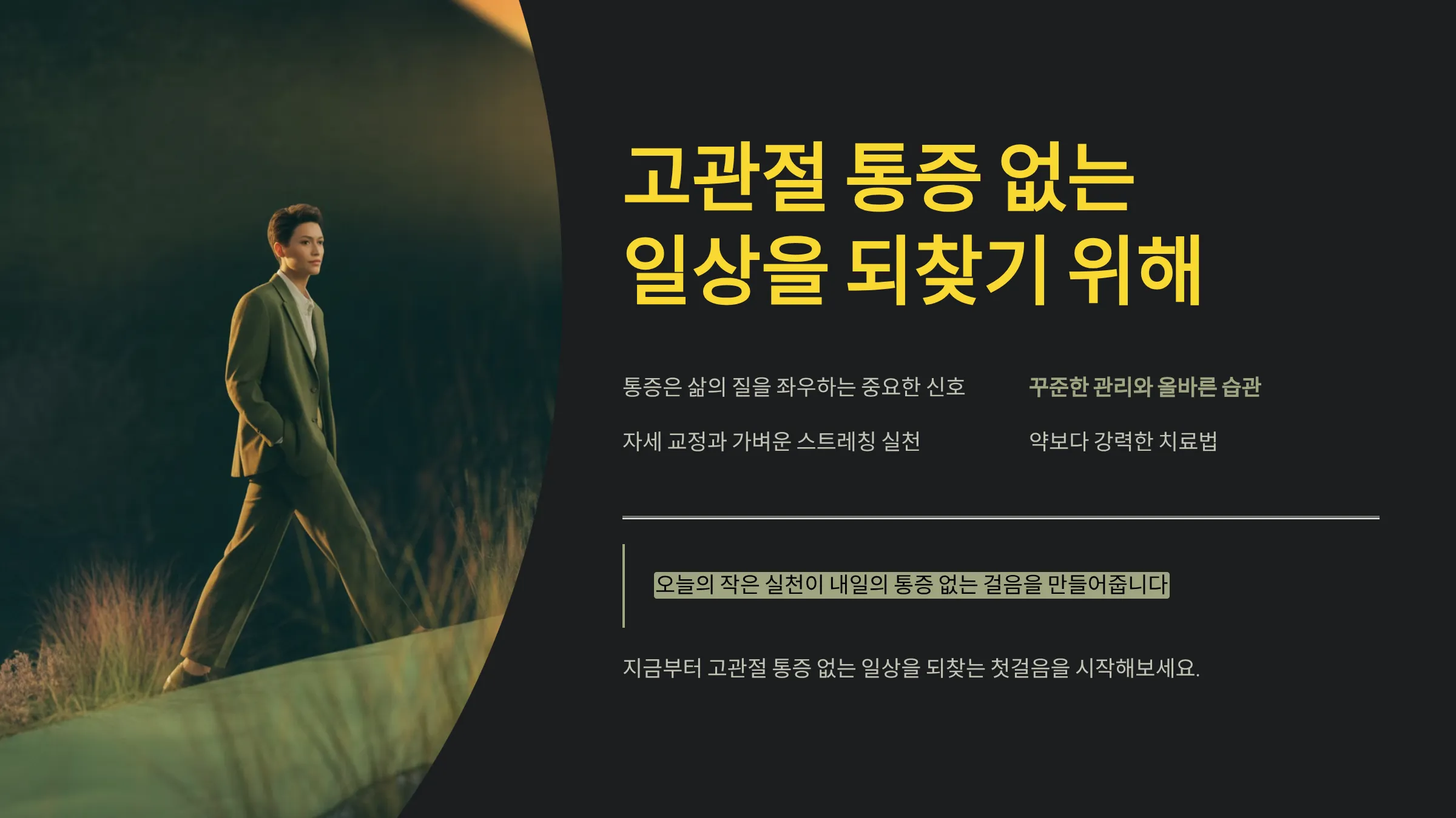 꾸준한 관리와 올바른 습관은 약보다 강력한 치료법이 됩니다. 오늘의 작은 실천이 내일의 통증 없는 걸음을 만들어줍니다. 지금부터 고관절 통증 없는 일상을 되찾는 첫걸음을 시작해보세요.