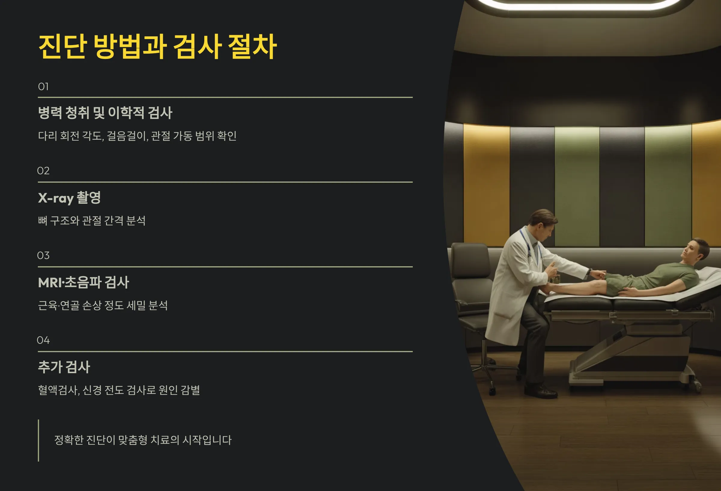 정확한 원인을 찾기 위해서는 병력 청취와 함께 이학적 검사가 진행됩니다. 의사는 다리의 회전 각도, 걸음걸이, 관절의 가동 범위를 확인하고 통증 부위를 압박해 원인을 추정합니다. 이후 X-ray 촬영으로 뼈 구조와 관절 간격을 확인하고, MRI나 초음파로 근육·연골 손상 정도를 세밀하게 분석합니다.