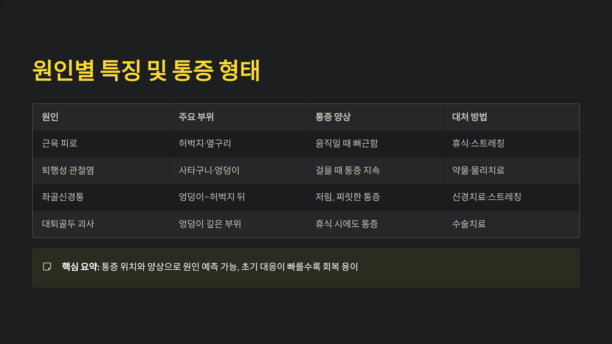 원인 주요 부위 통증 양상 대처 방법
