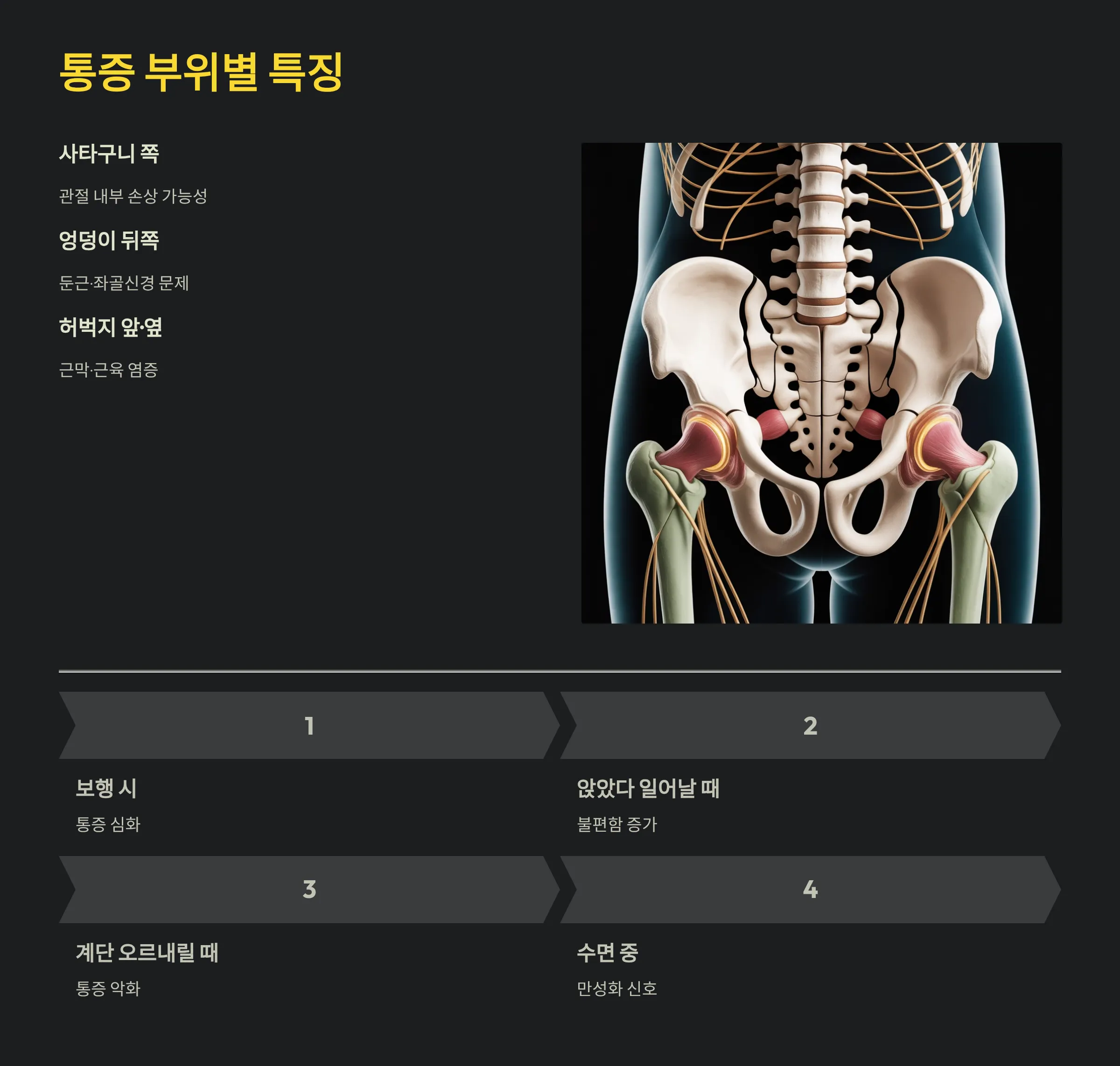 통증 위치와 양상만으로도 고관절 통증의 원인을 예측할 수 있으며, 초기 대응이 빠를수록 회복이 쉽습니다.