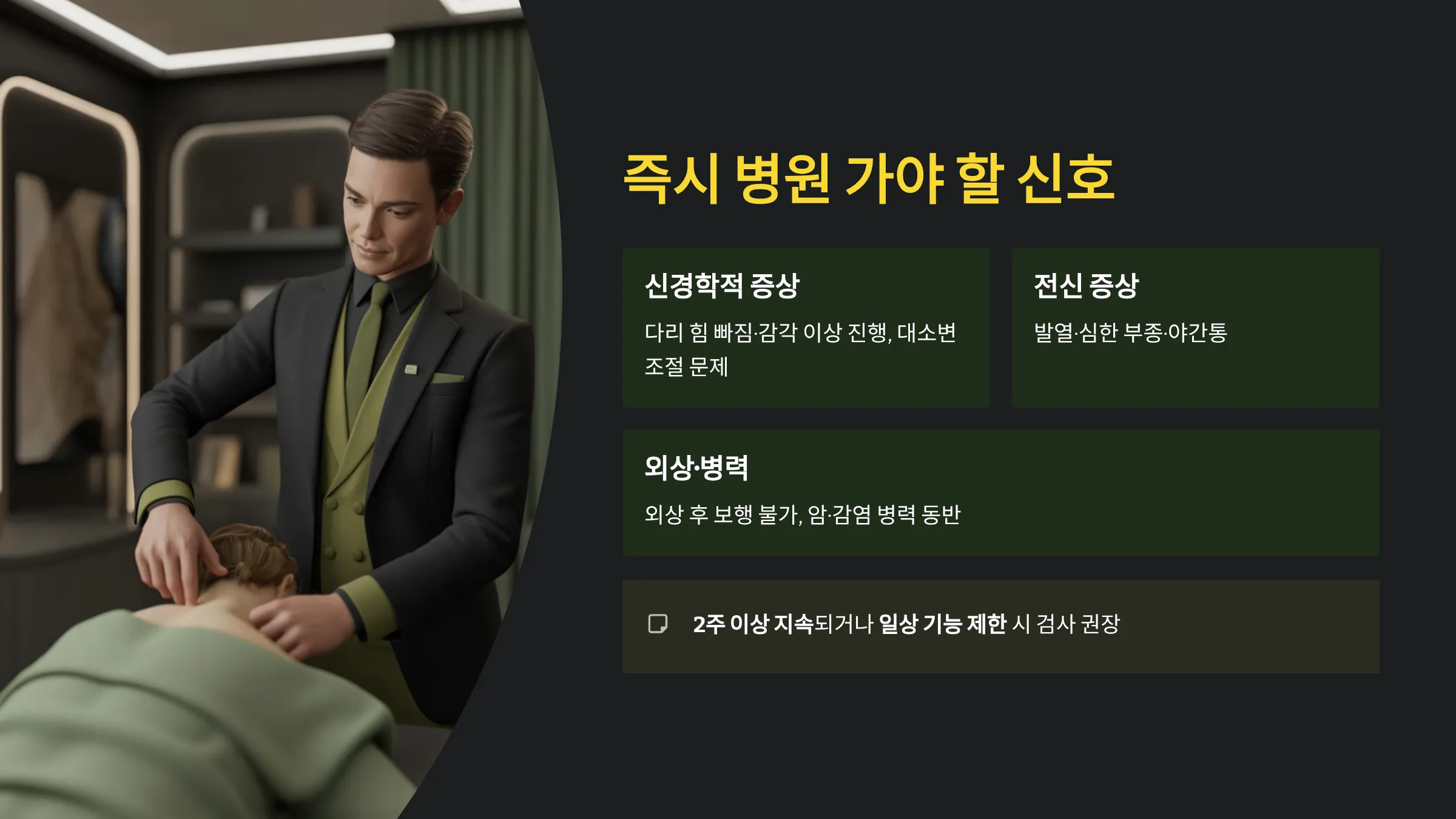 다리 힘 빠짐·감각 이상이 진행될 때, 대소변 조절 문제, 발열·심한 부종·야간통, 외상 직후 보행 불가, 암·감염 병력 동반 시 즉시 진료가 필요합니다. 엉덩이 아래 통증이 2주 이상 지속되거나 일상 기능을 제한하면 검사를 권합니다.