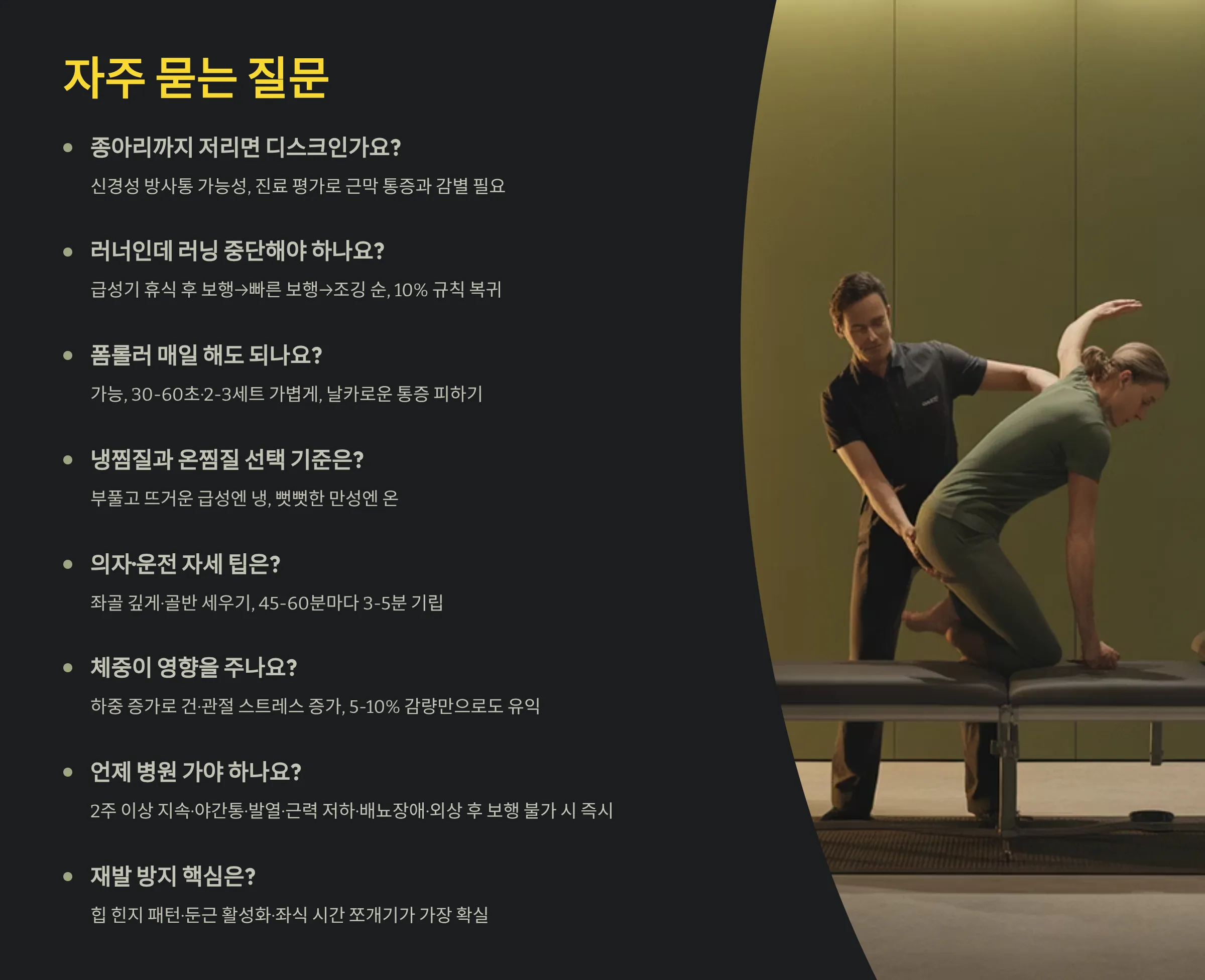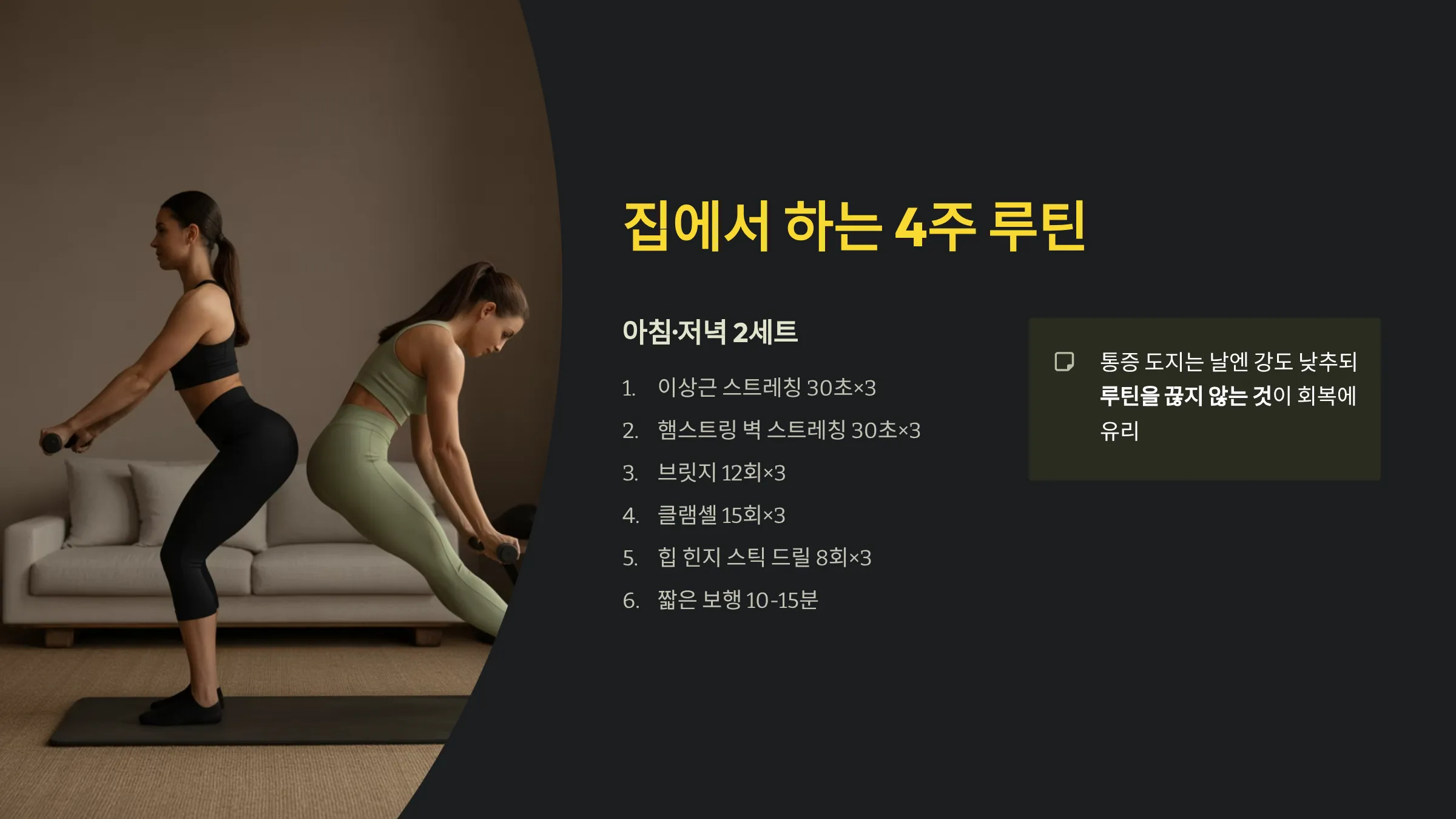 엉덩이 아래 통증이 도지는 날엔 강도를 낮추되 루틴을 끊지 않는 것이 회복에 유리합니다.