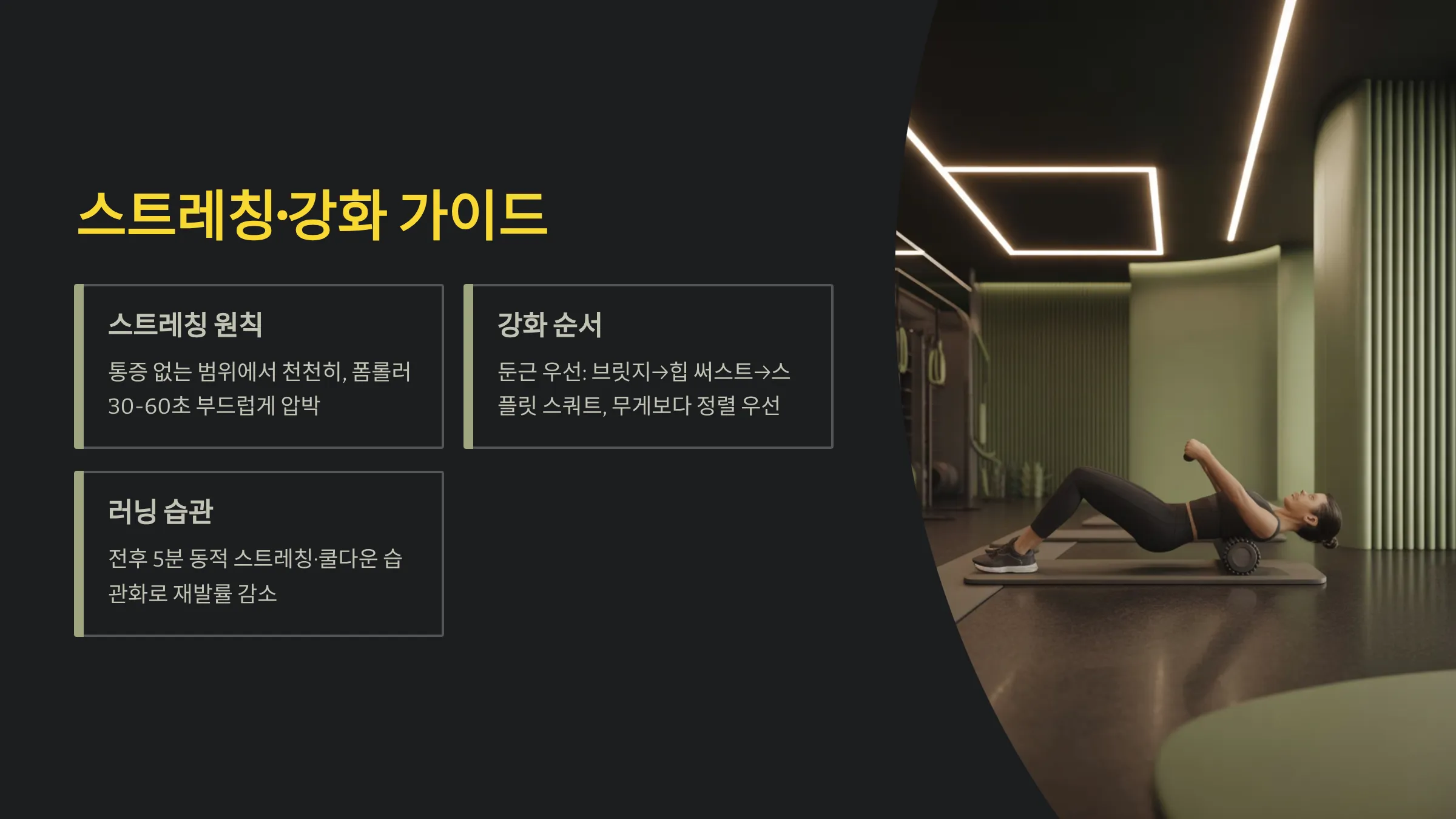 스트레칭은 통증 없는 범위에서 천천히 진행합니다. 폼롤러는 둔근·대퇴외측근막·햄스트링을 30~60초 부드럽게 압박하고, 날카로운 통증이 나면 강도를 낮춥니다. 강화는 둔근 우선: 브릿지→힙 써스트→스플릿 스쿼트 순으로 난도를 올리며, 무게보다 정렬(무릎·발끝 정면, 골반 수평)을 우선합니다. 러닝 전후 5분 동적 스트레칭·쿨다운을 습관화하면 엉덩이 아래 통증 재발률을 낮출 수 있습니다.
