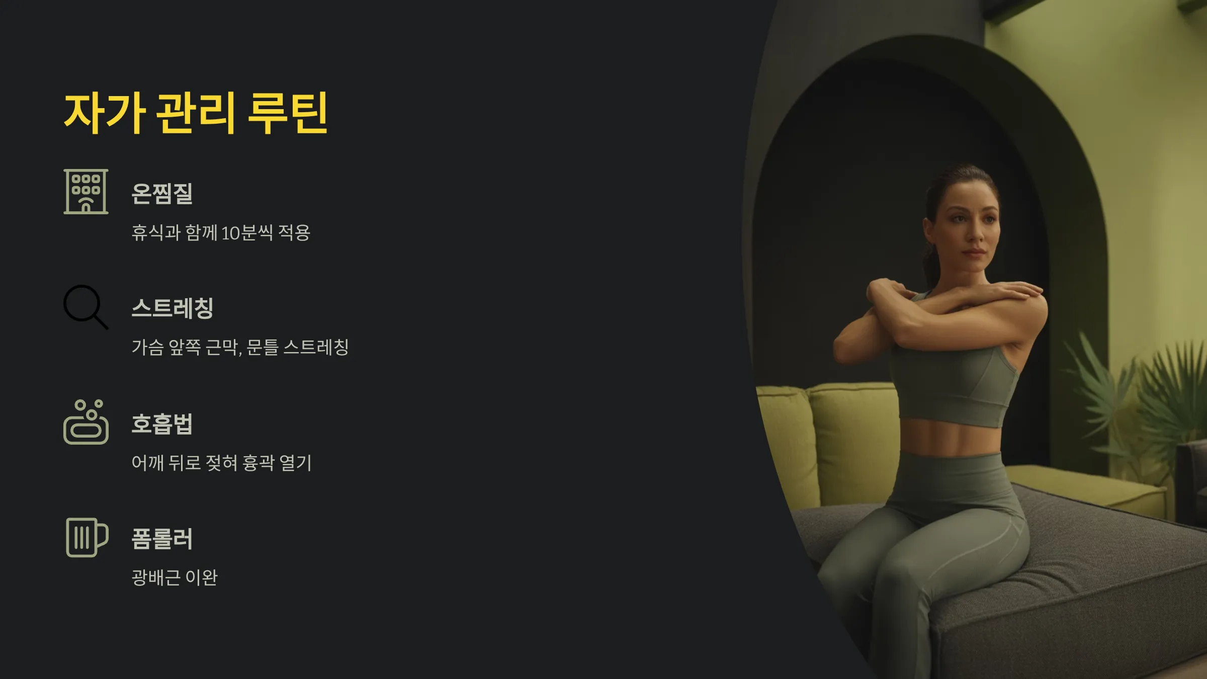 초기 겨드랑이 통증은 휴식과 온찜질이 도움이 됩니다. 가슴 앞쪽 근막과 겨드랑이 앞면을 스트레칭하고, 어깨를 뒤로 젖혀 흉곽을 열어주는 호흡법을 적용하면 회복 속도가 빨라집니다. 폼롤러를 이용해 광배근을 풀어주는 것도 좋습니다. 운동 시에는 무리한 가슴 운동을 피하고, 팔을 내릴 때 어깨가 들리지 않도록 주의하며, 팔 위치를 바르게 유지하는 것이 중요합니다.