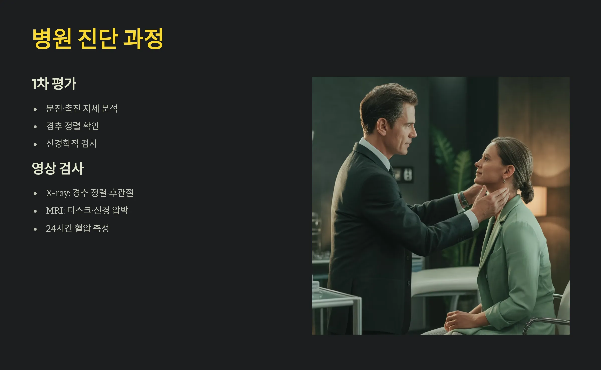 뒷머리 통증은 문진·촉진·자세 분석을 통해 1차 감별합니다. 필요 시 X-ray로 경추 정렬·후관절 상태를 확인하며, 신경학적 의심이 있으면 MRI로 디스크·신경 압박 여부를 평가합니다. 긴장성 두통이 의심되면 스트레스·수면 패턴·턱관절 기능을 함께 확인합니다. 혈압 변동성 의심 시 24시간 혈압 측정도 활용됩니다.