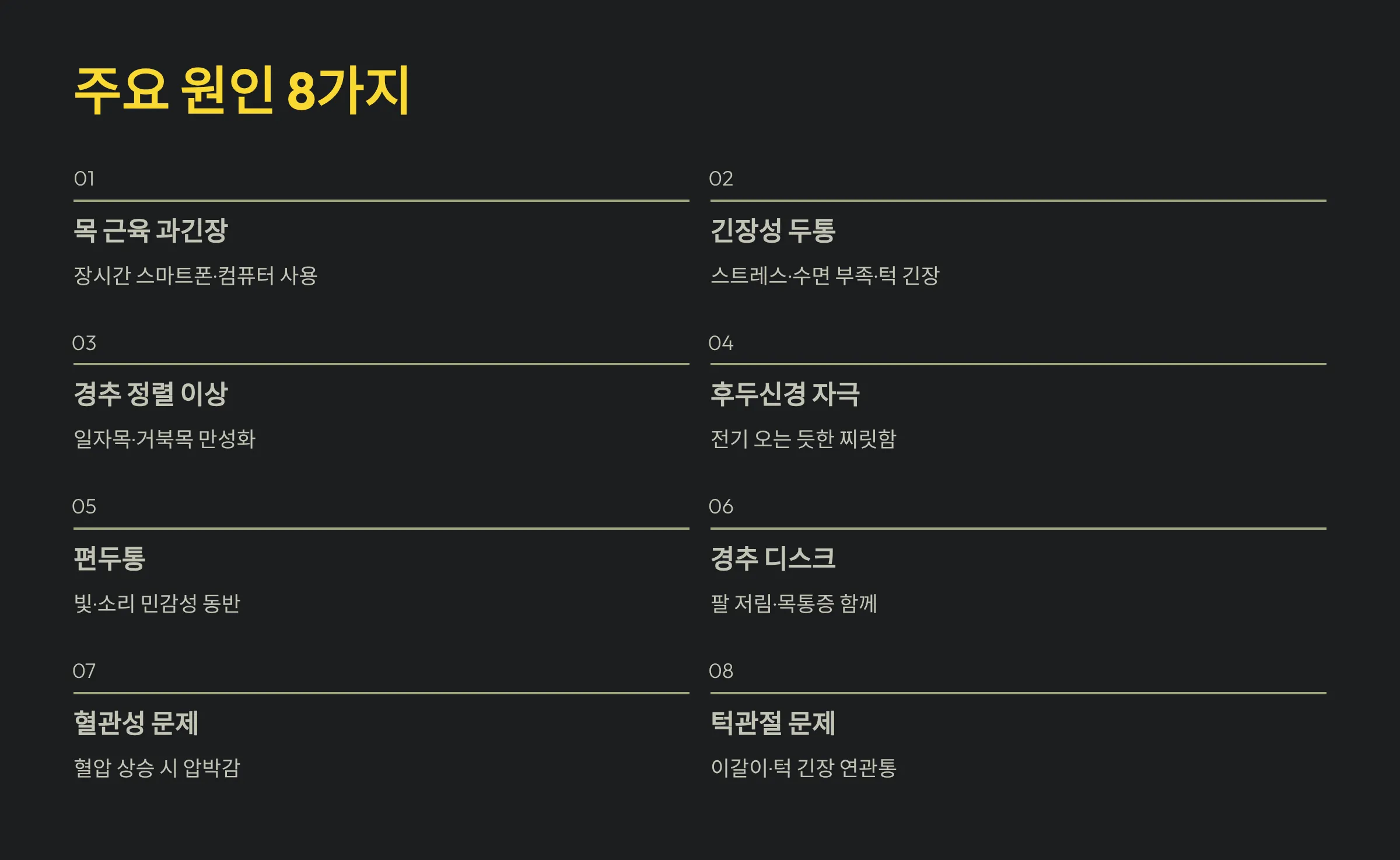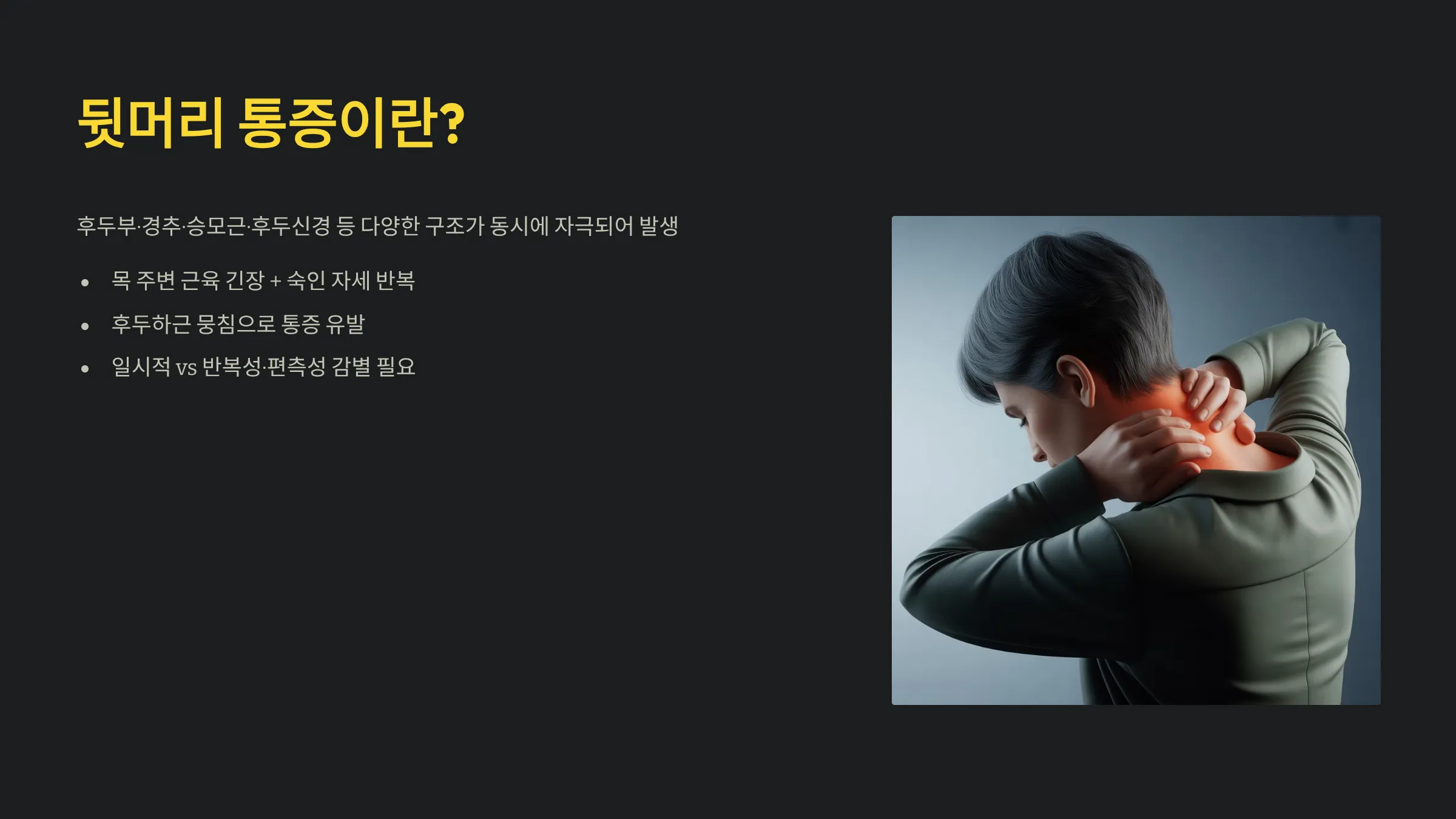 4) 후두신경 자극: 후두신경통은 전기가 오는 듯한 뒷머리 통증을 만들며 턱·목 움직임에 민감합니다.