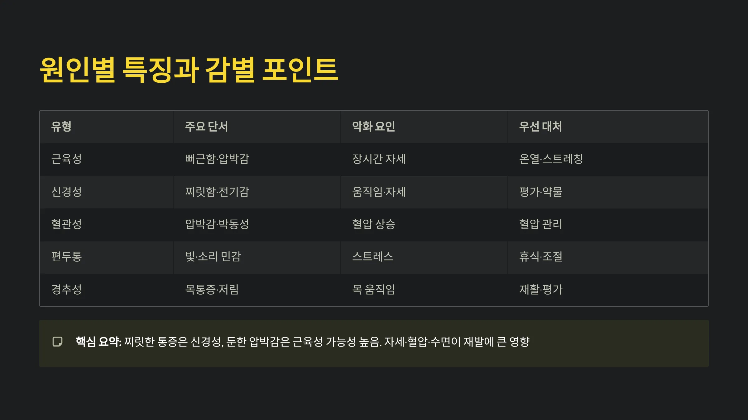 | 근육성 | 뻐근함·압박감 | 장시간 자세 | 온열·스트레칭 |