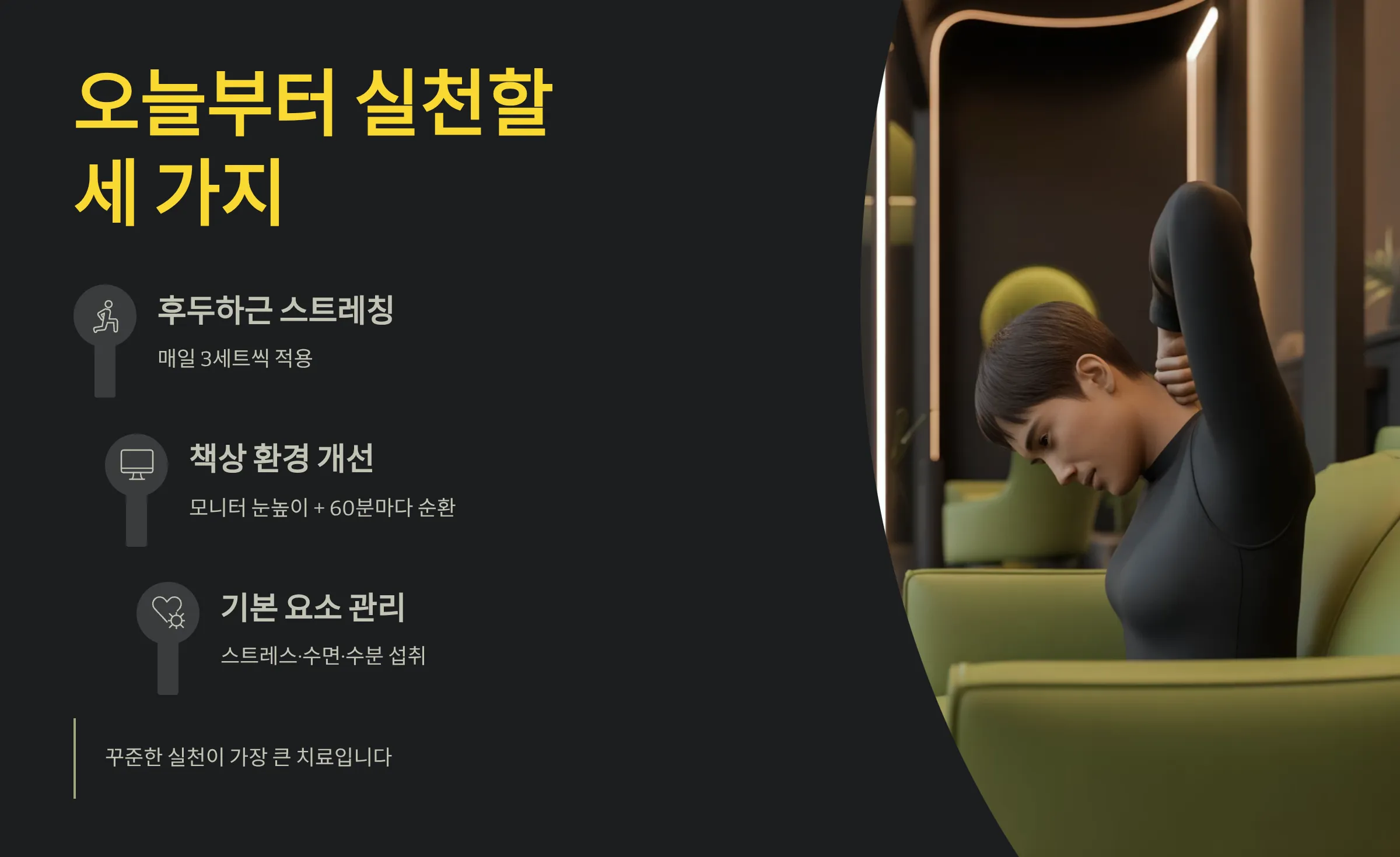 오늘부터 실천할 세 가지를 권합니다. 첫째, 후두하근 스트레칭을 매일 3세트씩 적용하십시오. 둘째, 모니터 상단을 눈높이에 맞추고 60분마다 일어나 순환 루틴을 실행하십시오. 셋째, 스트레스·수면·수분 섭취라는 기본 요소를 관리하면 뒷머리 통증 재발 주기가 눈에 띄게 줄어듭니다. 꾸준한 실천이 가장 큰 치료입니다.
