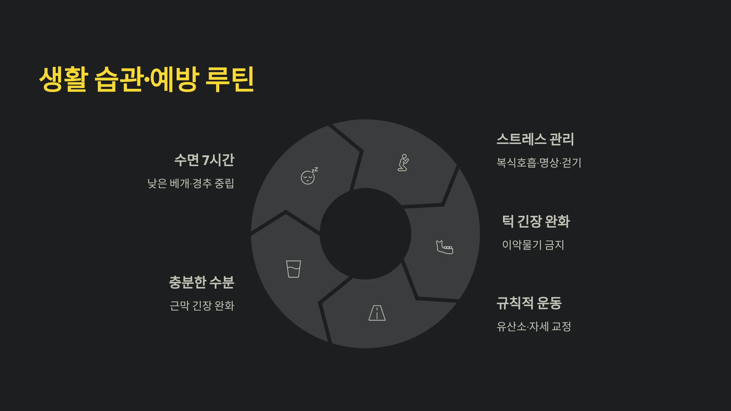 · 수면 7시간 확보 · 낮은 베개·경추 중립 유지 · 스트레스 관리: 복식호흡·명상·걷기 · 턱 긴장 줄이기: 이악물기 금지 · 규칙적 유산소 운동·자세 교정 · 물 충분히 섭취해 근막 긴장 완화