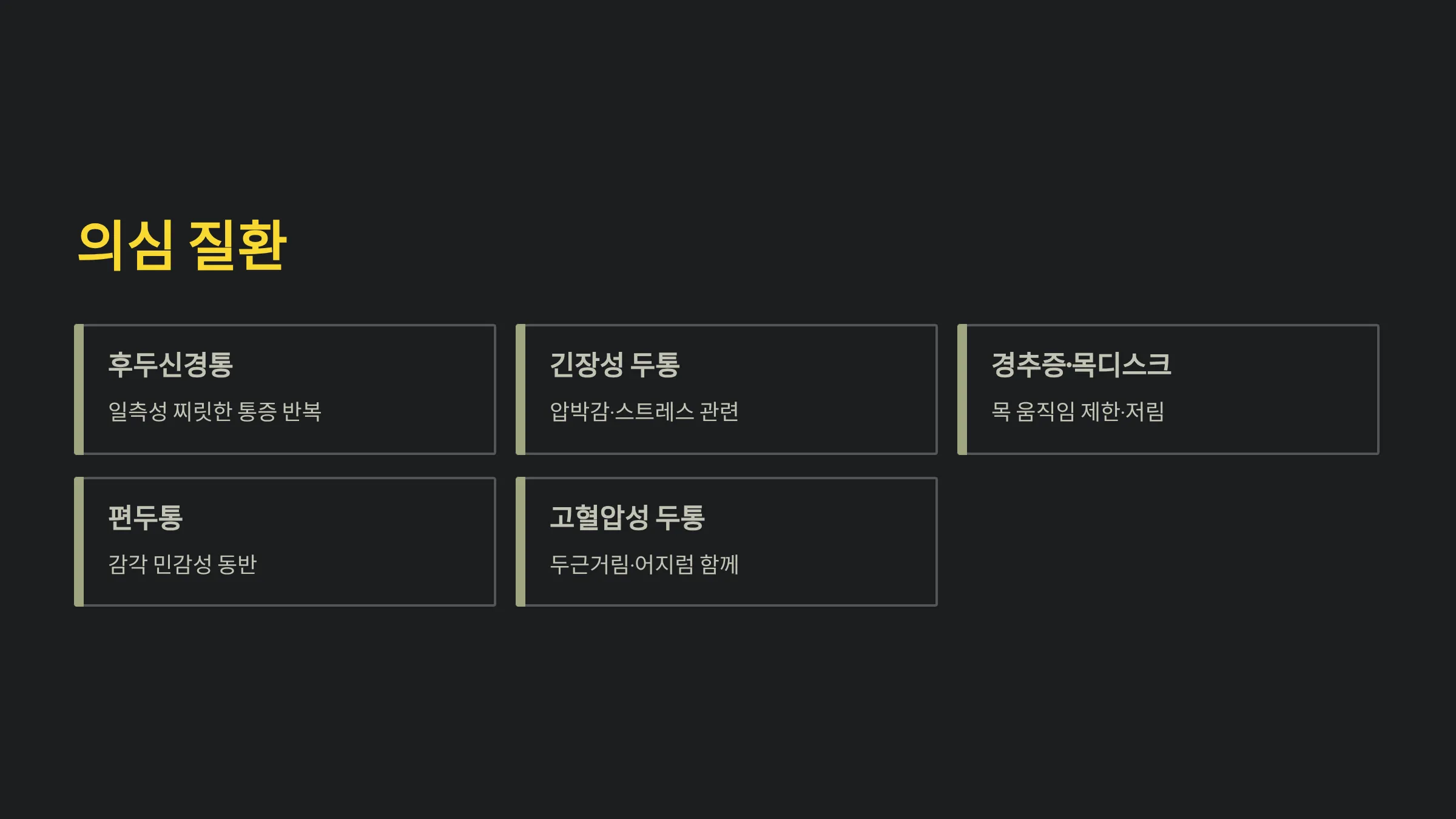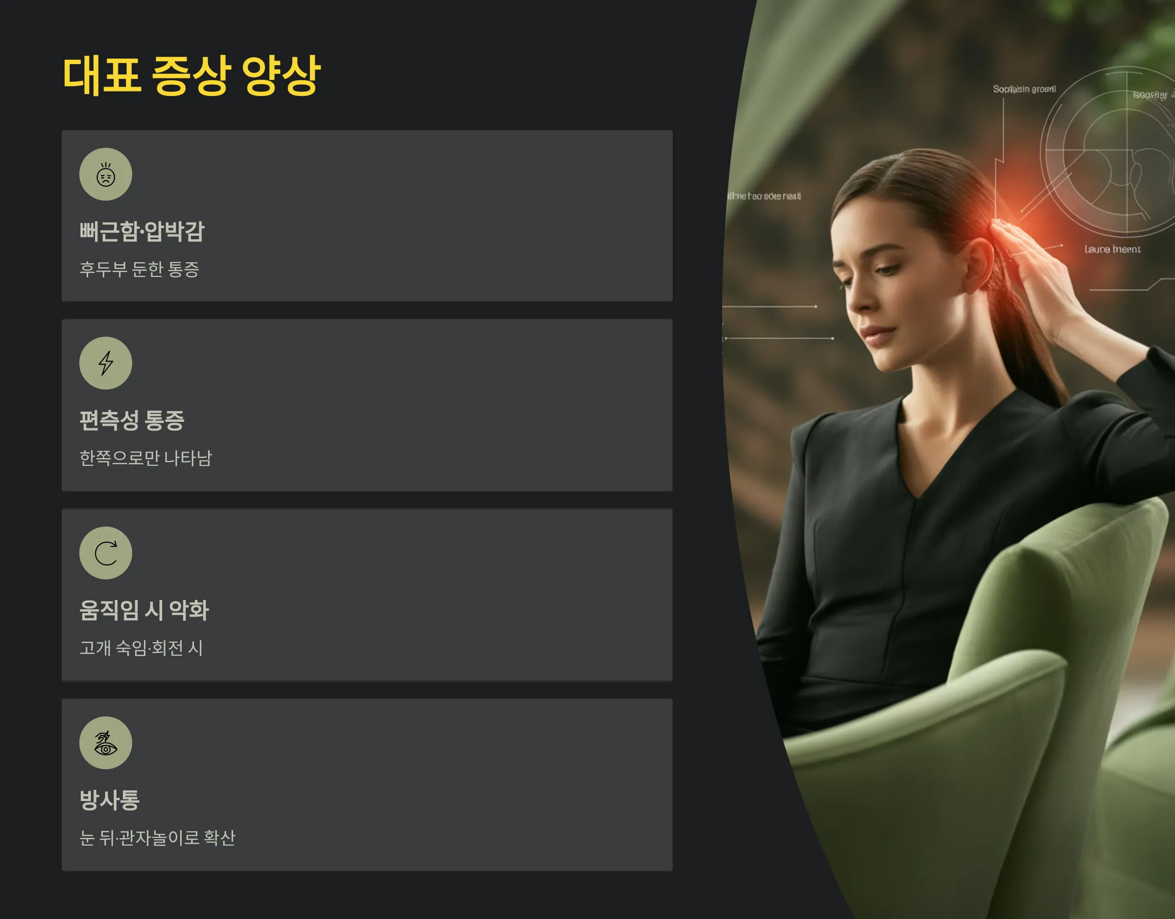 | 편두통 | 빛·소리 민감 | 스트레스 | 휴식·조절 |