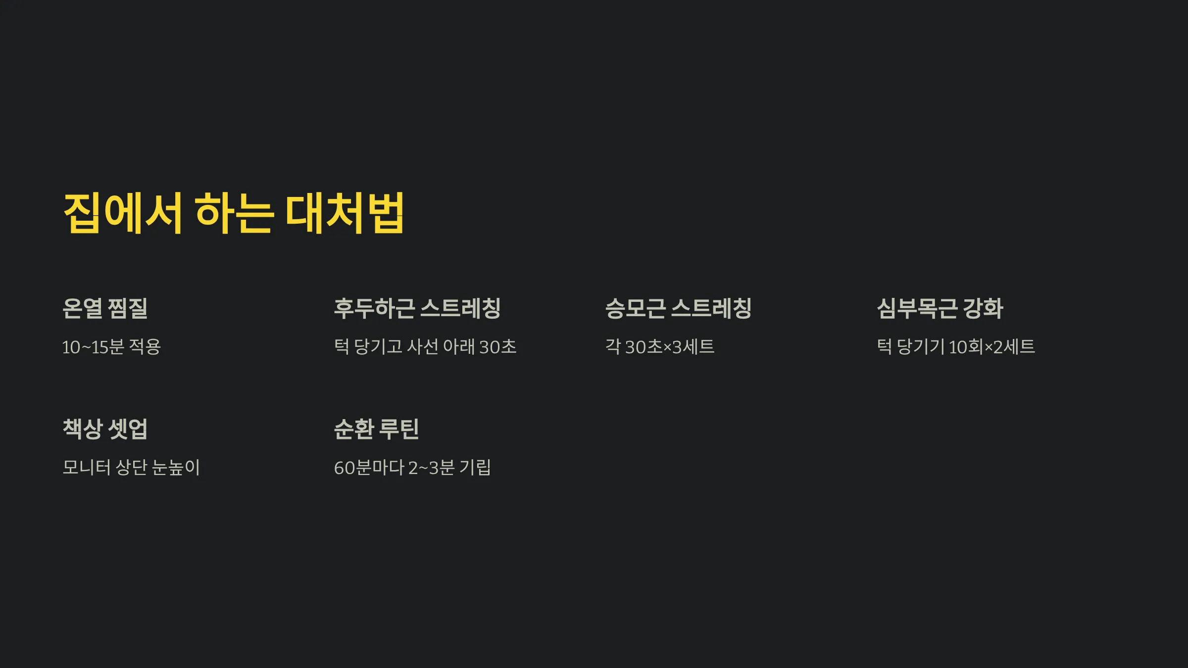 · 온열 10~15분 적용 · 후두하근 스트레칭: 턱을 살짝 당기고 고개를 사선 아래로 숙여 30초 유지 · 승모근·견갑거근 스트레칭 각 30초×3세트 · 심부목근 강화 운동: 턱 당기기 10회×2세트 · 책상 셋업: 모니터 상단을 눈높이에 맞추고 어깨 말림 방지 · 60분마다 2–3분 기립·어깨 돌리기