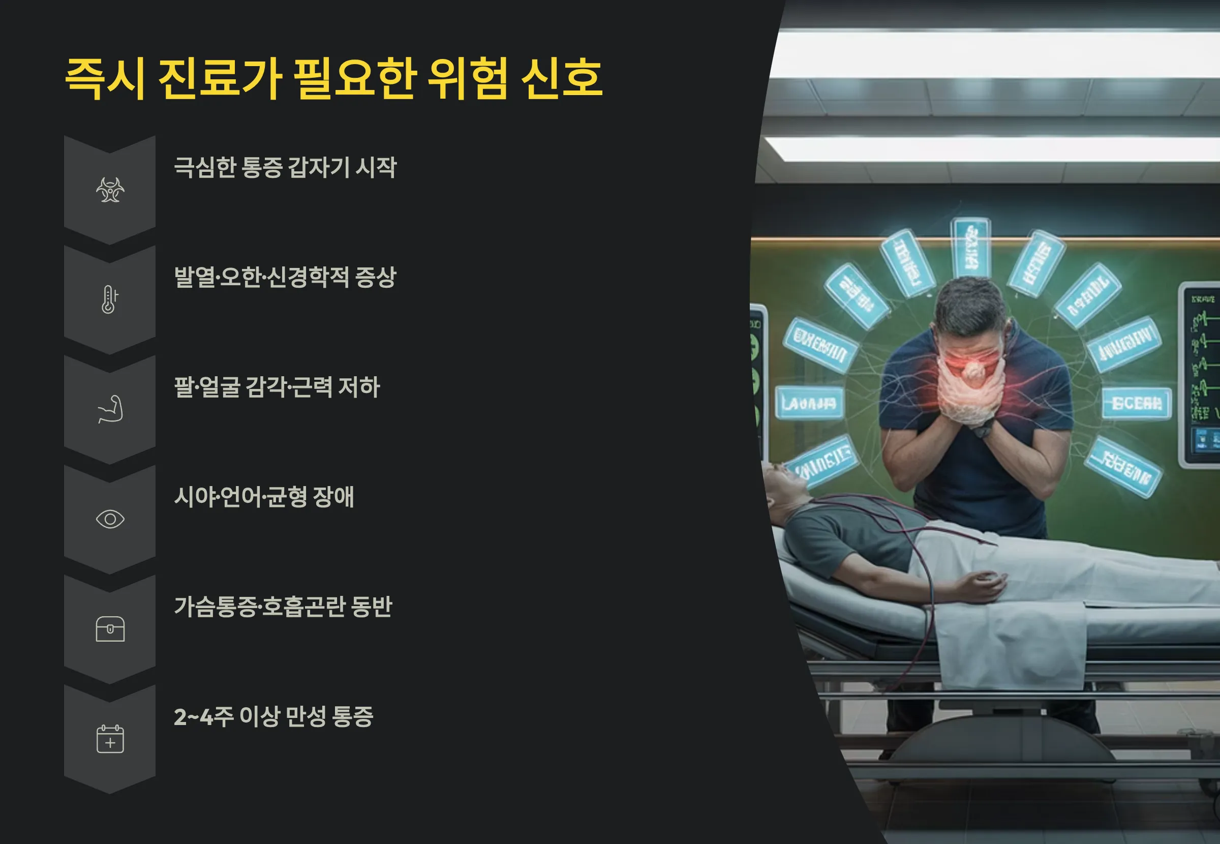 · 극심한 뒷머리 통증이 갑자기 시작됨 · 발열·오한·신경학적 증상 동반 · 팔·얼굴 감각 저하 또는 근력 저하 · 시야 장애·언어 장애·균형 감각 상실 · 가슴통증·호흡곤란과 동반되는 뒷머리 통증 · 2–4주 이상 지속되는 만성 후두부 통증
