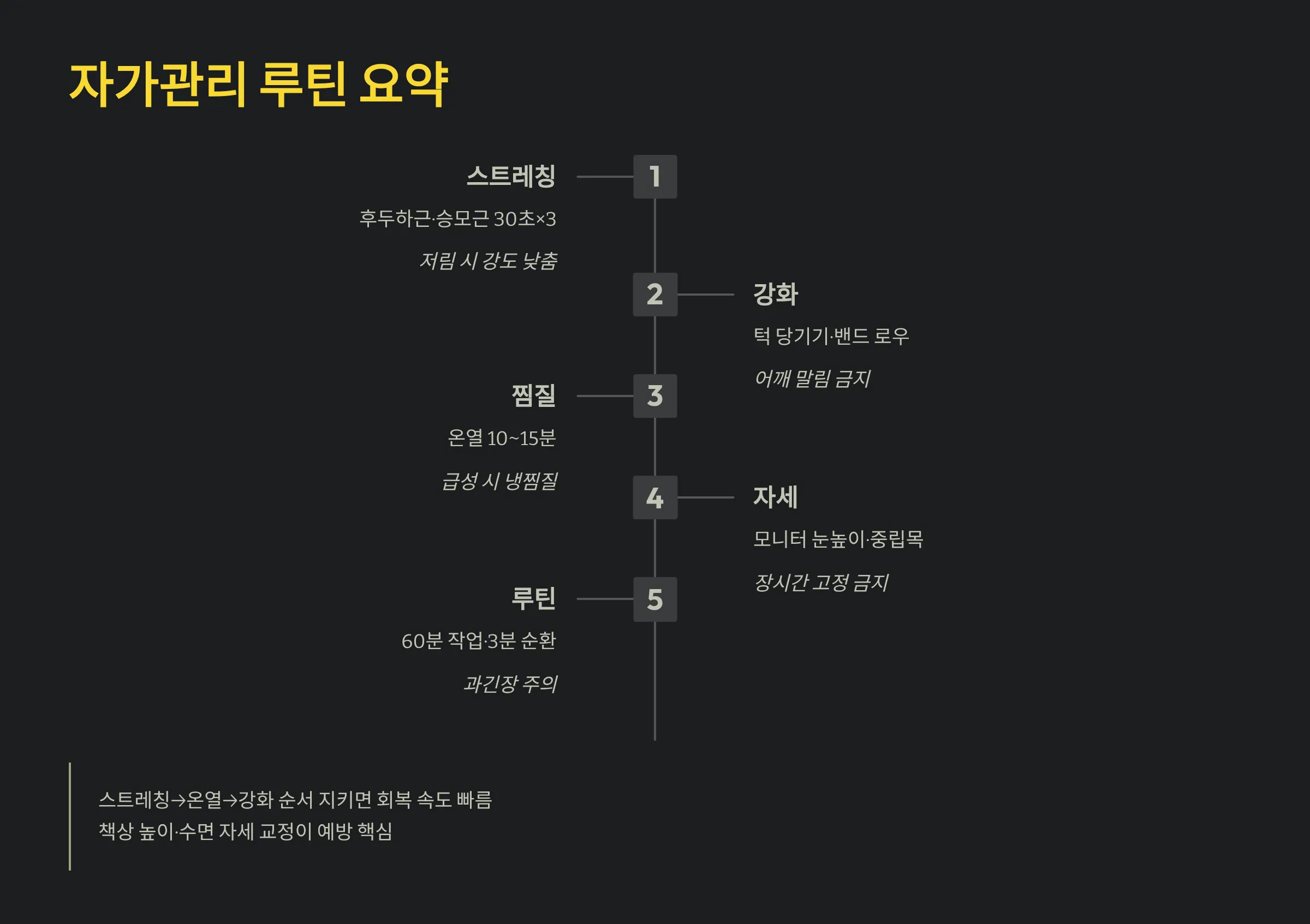 요약 1) 스트레칭→온열→강화 순서를 지키면 회복 속도가 빠릅니다.
