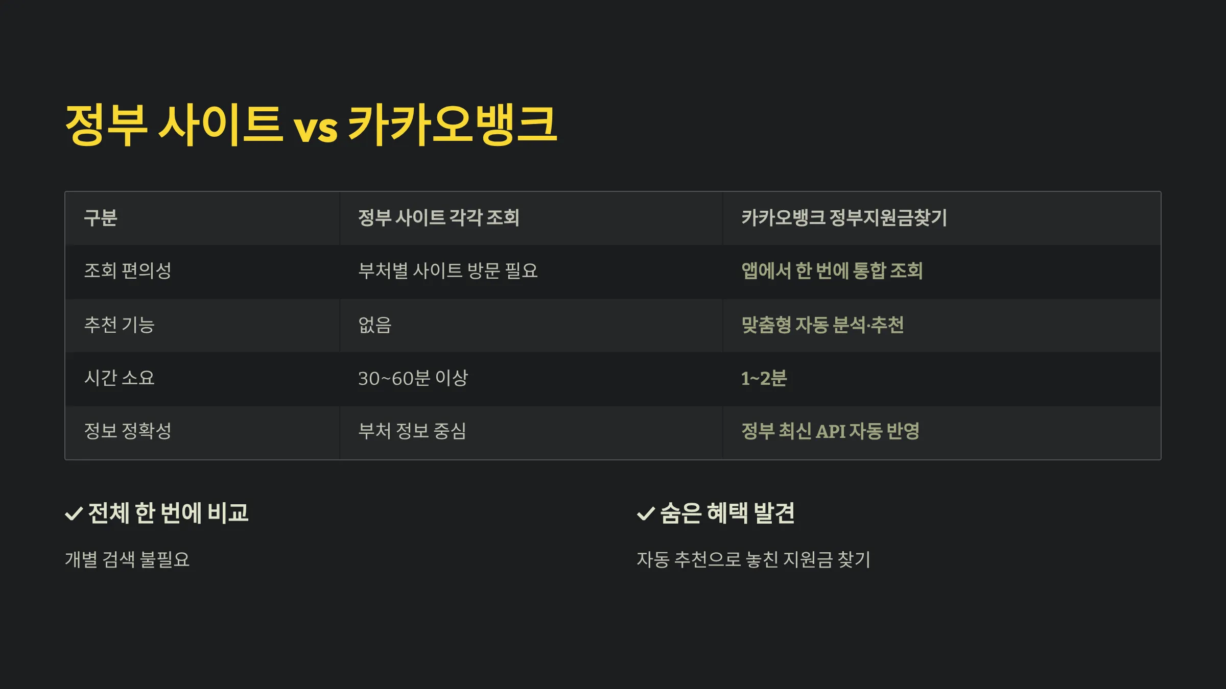 요약 1) 정부 사이트는 개별 검색이 필요하지만, 카카오뱅크 정부지원금찾기는 전체를 한 번에 비교할 수 있습니다. 요약 2) 자동 추천 기능은 받지 못하고 있던 숨은 혜택을 찾아주는 큰 장점이 있습니다.