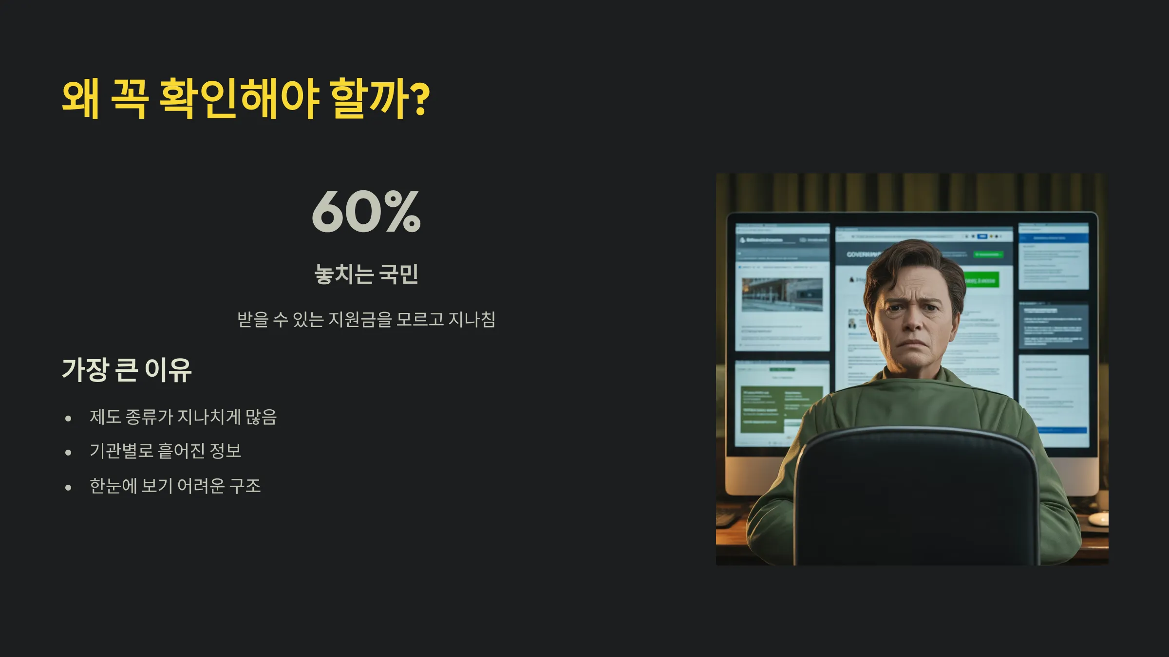 정부 통계에 따르면 국민 10명 중 6명은 받을 수 있는 정부지원금을 놓치고 있는 것으로 나타났습니다. 가장 큰 이유는 제도 종류가 지나치게 많고, 기관별로 흩어져 있어 한눈에 보기 어렵기 때문입니다. 카카오뱅크 정부지원금찾기는 이러한 불편을 해소하며, 숨은 혜택을 빠르게 찾도록 돕습니다.