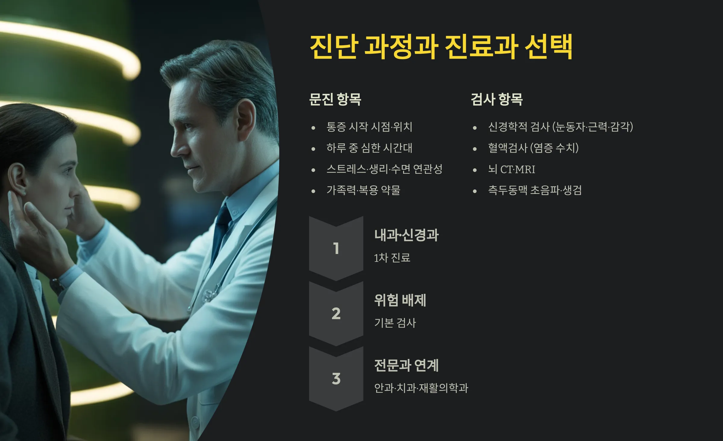 기본 신경학적 검사(눈동자 반응, 근력, 감각, 균형 검사)를 통해 위험 소견이 없는지 확인하고, 필요 시 혈액검사(염증 수치, ESR·CRP), 뇌 CT·MRI, 혈관검사, 측두동맥 초음파·생검 등이 추가될 수 있습니다. 처음 어느 과를 가야 할지 헷갈린다면, 내과·신경과·가정의학과에서 시작해 관자놀이 통증의 큰 위험을 먼저 배제하고, 결과에 따라 안과·류마티스내과·치과·재활의학과 등으로 연계받는 흐름이 일반적입니다.